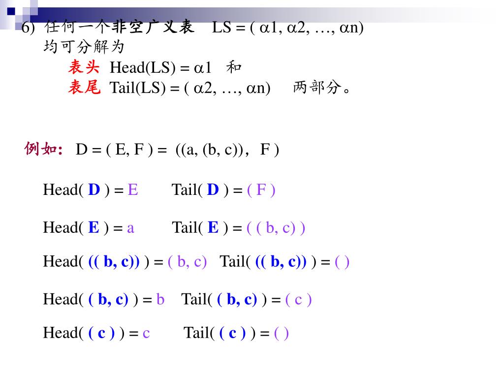 6) 任何一个非空广义表LS = ( 1, 2, …, n) 均可分解为 表头Head(LS) = 1 和 表尾Tail(LS) = ( 2, …, n) 两部分。 例如: D = ( E, F ) = ((a, (b, c)),F ) Head( D ) = E Tail( D ) = ( F ) Head( E ) = a Tail( E ) = ( ( b, c) ) Head( (( b, c)) ) = ( b, c) Tail( (( b, c)) ) = ( ) Head( ( b, c) ) = b Tail( ( b, c) ) = ( c ) Head( ( c ) ) = c Tail( ( c ) ) = ( )