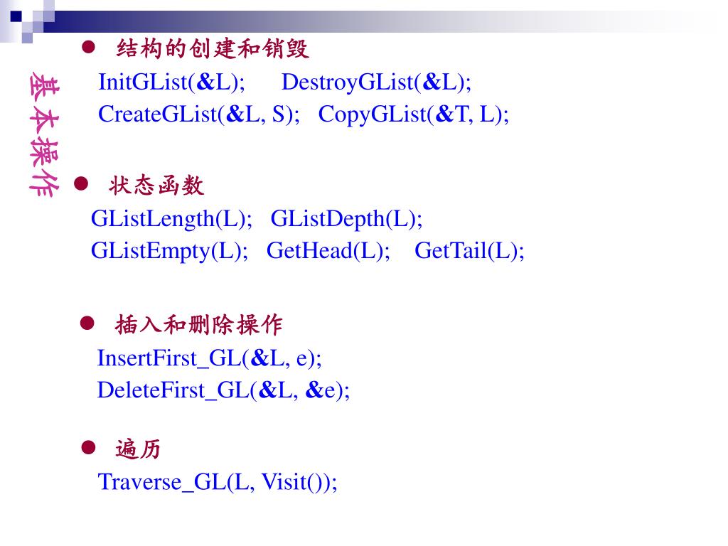 结构的创建和销毁 InitGList(&L); DestroyGList(&L); CreateGList(&L, S); CopyGList(&T, L); 基本操作 状态函数 GListLength(L); GListDepth(L); GListEmpty(L); GetHead(L); GetTail(L); 插入和删除操作 InsertFirst_GL(&L, e); DeleteFirst_GL(&L, &e); 遍历 Traverse_GL(L, Visit());