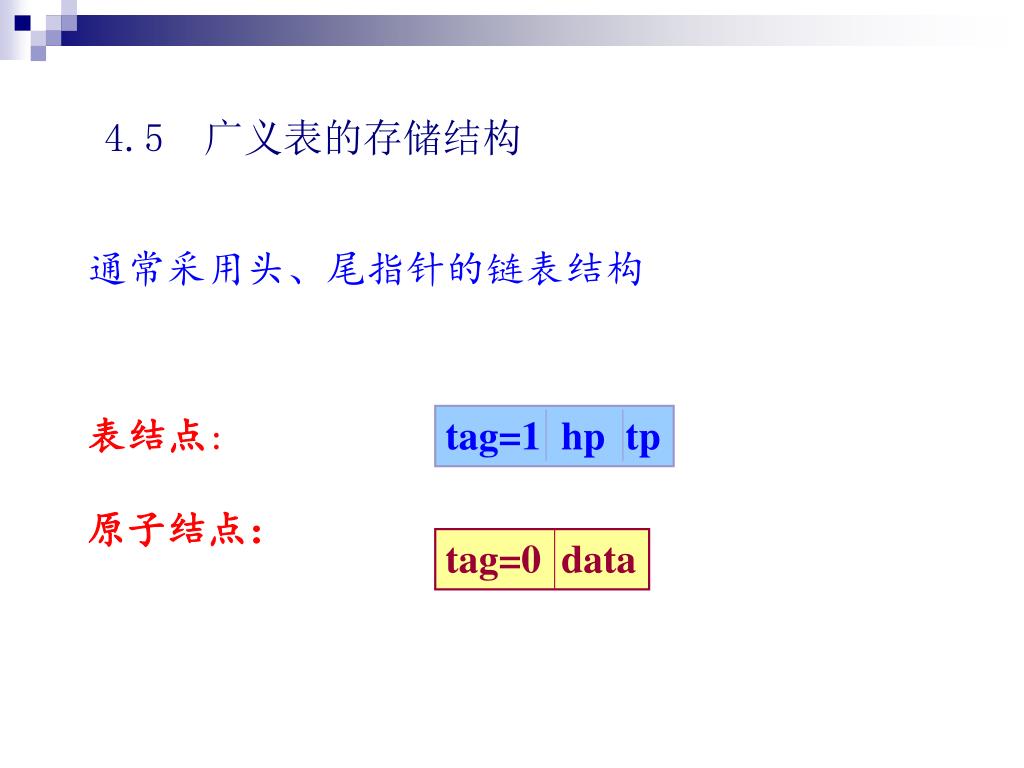 4.5 广义表的存储结构 通常采用头、尾指针的链表结构 表结点: 原子结点: tag=1 hp tp tag=0 data