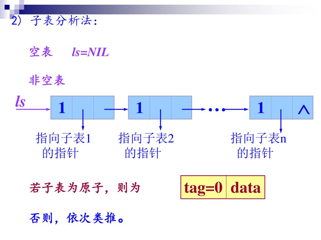 2) 子表分析法: 空表 ls=NIL 非空表 ls … 1 1 1 指向子表1 的指针 指向子表2 的指针 指向子表n 的指针 tag=0 data 若子表为原子,则为 否则,依次类推。