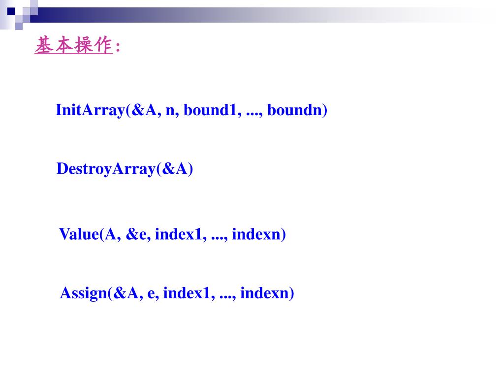 基本操作: InitArray(&A, n, bound1, ..., boundn) DestroyArray(&A) Value(A, &e, index1, ..., indexn) Assign(&A, e, index1, ..., indexn)