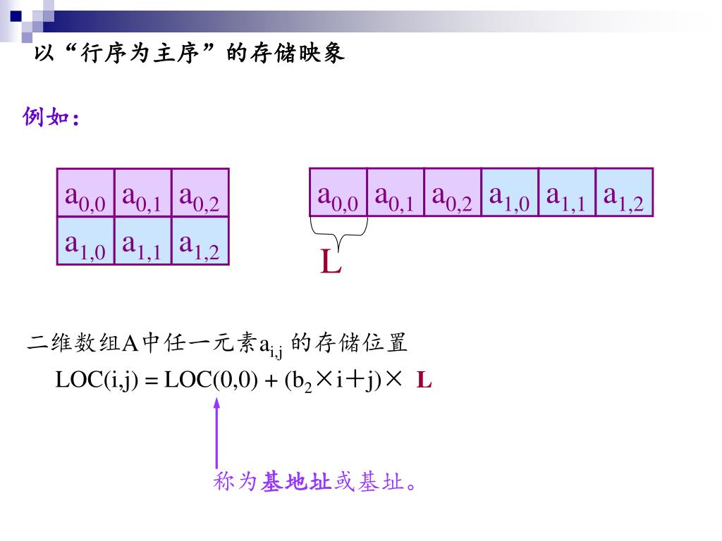以“行序为主序”的存储映象 例如: a0,0 a0,1 a0,2 a1,0 a1,1 a1,2 a0,0 a0,1 a0,2 a1,0 a1,1 a1,2 L 二维数组A中任一元素ai,j的存储位置 LOC(i,j) = LOC(0,0) + (b2×i+j)× L 称为基地址或基址。