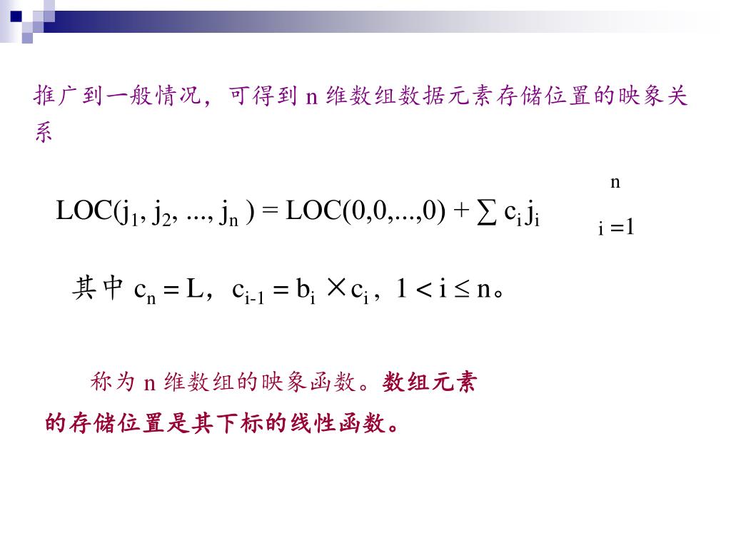推广到一般情况,可得到 n 维数组数据元素存储位置的映象关系 n LOC(j1, j2, ..., jn ) = LOC(0,0,...,0) + ∑ ci ji =1 i 其中 cn = L,ci-1 = bi ×ci , 1 < i n。 称为 n 维数组的映象函数。数组元素 的存储位置是其下标的线性函数。