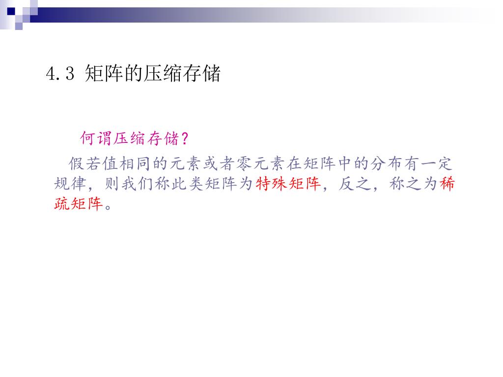 4.3矩阵的压缩存储 何谓压缩存储? 假若值相同的元素或者零元素在矩阵中的分布有一定规律,则我们称此类矩阵为特殊矩阵,反之,称之为稀疏矩阵。