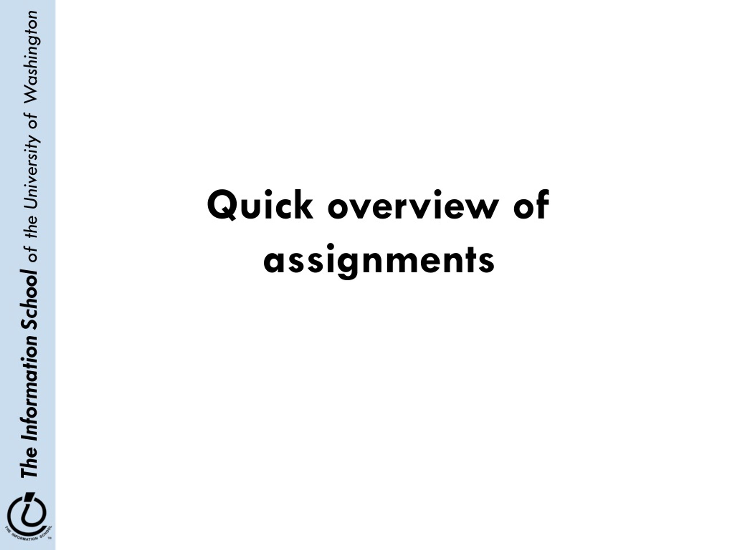 Assignments • Design exercises (4 assignments) • Studying artifacts • Organize facts and deriving concepts (group) … • Interactive prototype project • Quarter-long, individual work • Four intermediate deliverables • Final deliverable: 13 December