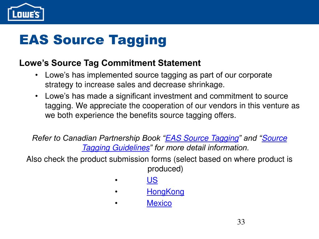 EAS Source Tagging • Lowe’s Source Tag Commitment Statement • Lowe’s has implemented source tagging as part of our corporate strategy to increase sales and decrease shrinkage. • Lowe’s has made a significant investment and commitment to source tagging. We appreciate the cooperation of our vendors in this venture as we both experience the benefits source tagging offers. • Refer to Canadian Partnership Book “EAS Source Tagging” and “Source Tagging Guidelines” for more detail information. • Also check the product submission forms (select based on where product is produced) • US • HongKong • Mexico