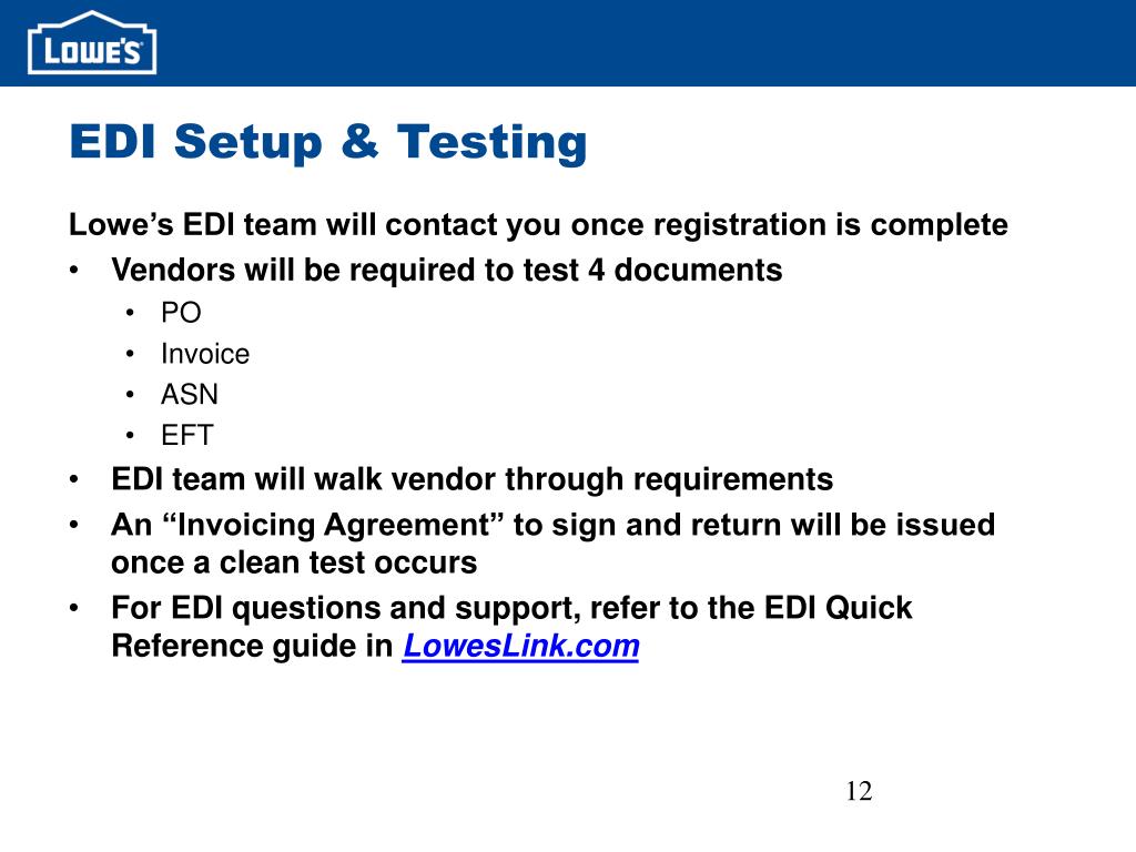 EDI Setup & Testing • Lowe’s EDI team will contact you once registration is complete • Vendors will be required to test 4 documents • PO • Invoice • ASN • EFT • EDI team will walk vendor through requirements • An “Invoicing Agreement” to sign and return will be issued once a clean test occurs • For EDI questions and support, refer to the EDI Quick Reference guide in LowesLink.com