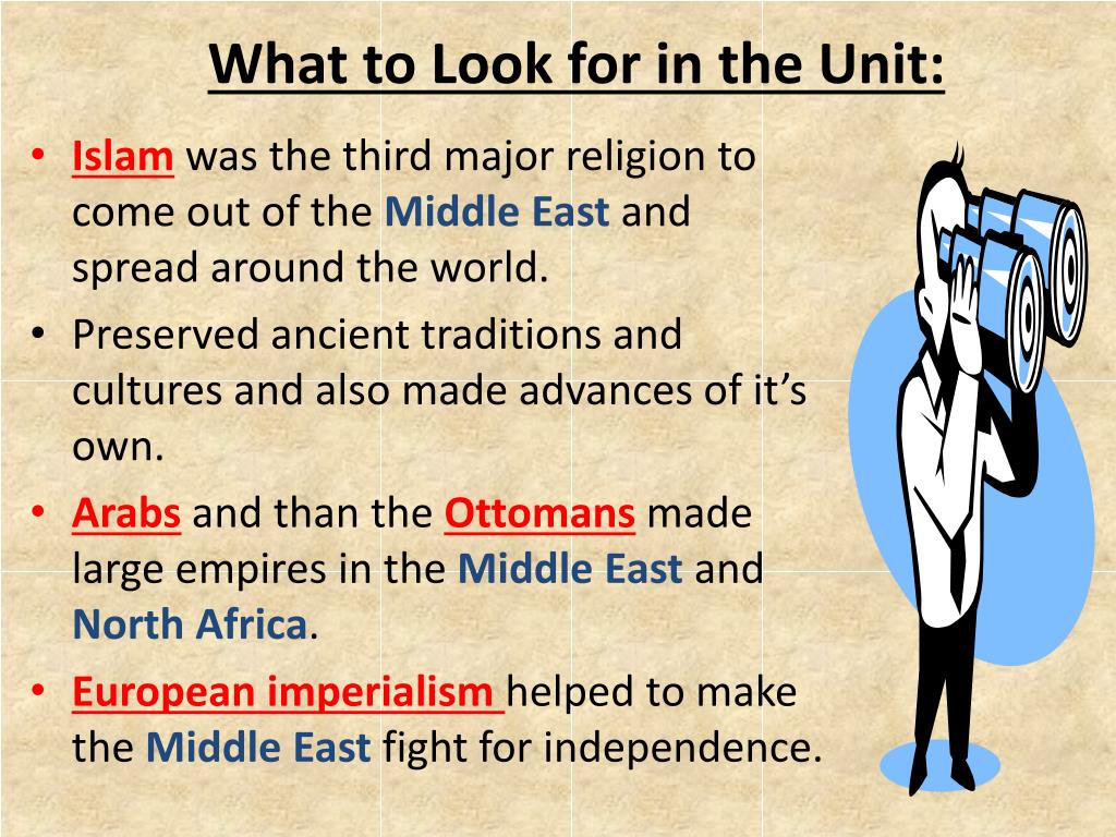 What to Look for in the Unit: • Islam was the third major religion to come out of the Middle East and spread around the world. • Preserved ancient traditions and cultures and also made advances of it’s own. • Arabs and than the Ottomans made large empires in the Middle East and North Africa. • European imperialism helped to make the Middle East fight for independence.