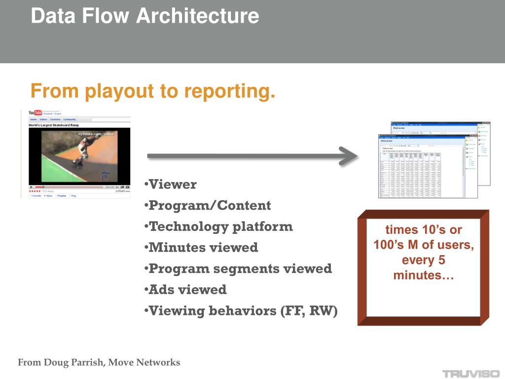 Data Flow Architecture • Viewer • Program/Content • Technology platform • Minutes viewed • Program segments viewed • Ads viewed • Viewing behaviors (FF, RW) times 10’s or 100’s M of users, every 5 minutes… From Doug Parrish, Move Networks From playout to reporting.