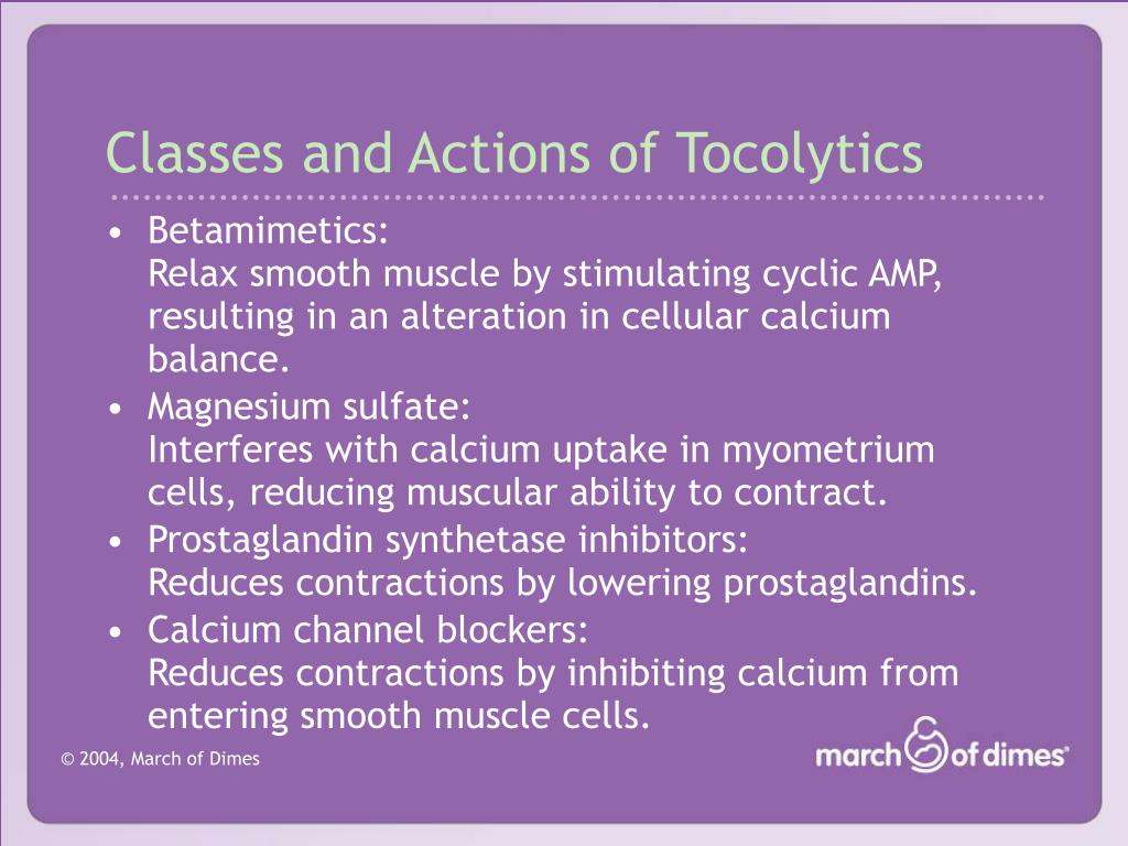 Classes and Actions of Tocolytics • Betamimetics: Relax smooth muscle by stimulating cyclic AMP, resulting in an alteration in cellular calcium balance. • Magnesium sulfate: Interferes with calcium uptake in myometrium cells, reducing muscular ability to contract. • Prostaglandin synthetase inhibitors: Reduces contractions by lowering prostaglandins. • Calcium channel blockers: Reduces contractions by inhibiting calcium from entering smooth muscle cells.