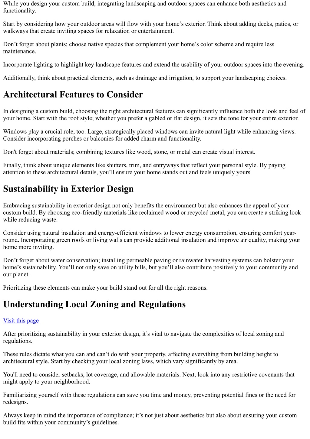 While you design your custom build, integrating landscaping and outdoor spaces can enhance both aesthetics and functionality. Start by considering how your outdoor areas will flow with your home’s exterior. Think about adding decks, patios, or walkways that create inviting spaces for relaxation or entertainment. Don’t forget about plants; choose native species that complement your home’s color scheme and require less maintenance. Incorporate lighting to highlight key landscape features and extend the usability of your outdoor spaces into the evening. Additionally, think about practical elements, such as drainage and irrigation, to support your landscaping choices. Architectural Features to Consider In designing a custom build, choosing the right architectural features can significantly influence both the look and feel of your home. Start with the roof style; whether you prefer a gabled or flat design, it sets the tone for your entire exterior. Windows play a crucial role, too. Large, strategically placed windows can invite natural light while enhancing views. Consider incorporating porches or balconies for added charm and functionality. Don't forget about materials; combining textures like wood, stone, or metal can create visual interest. Finally, think about unique elements like shutters, trim, and entryways that reflect your personal style. By paying attention to these architectural details, you’ll ensure your home stands out and feels uniquely yours. Sustainability in Exterior Design Embracing sustainability in exterior design not only benefits the environment but also enhances the appeal of your custom build. By choosing eco-friendly materials like reclaimed wood or recycled metal, you can create a striking look while reducing waste. Consider using natural insulation and energy-efficient windows to lower energy consumption, ensuring comfort year- round. Incorporating green roofs or living walls can provide additional insulation and improve air quality, making your home more inviting. Don’t forget about water conservation; installing permeable paving or rainwater harvesting systems can bolster your home’s sustainability. You’ll not only save on utility bills, but you’ll also contribute positively to your community and our planet. Prioritizing these elements can make your build stand out for all the right reasons. Understanding Local Zoning and Regulations Visit this page After prioritizing sustainability in your exterior design, it’s vital to navigate the complexities of local zoning and regulations. These rules dictate what you can and can’t do with your property, affecting everything from building height to architectural style. Start by checking your local zoning laws, which vary significantly by area. You'll need to consider setbacks, lot coverage, and allowable materials. Next, look into any restrictive covenants that might apply to your neighborhood. Familiarizing yourself with these regulations can save you time and money, preventing potential fines or the need for redesigns. Always keep in mind the importance of compliance; it’s not just about aesthetics but also about ensuring your custom build fits within your community’s guidelines.