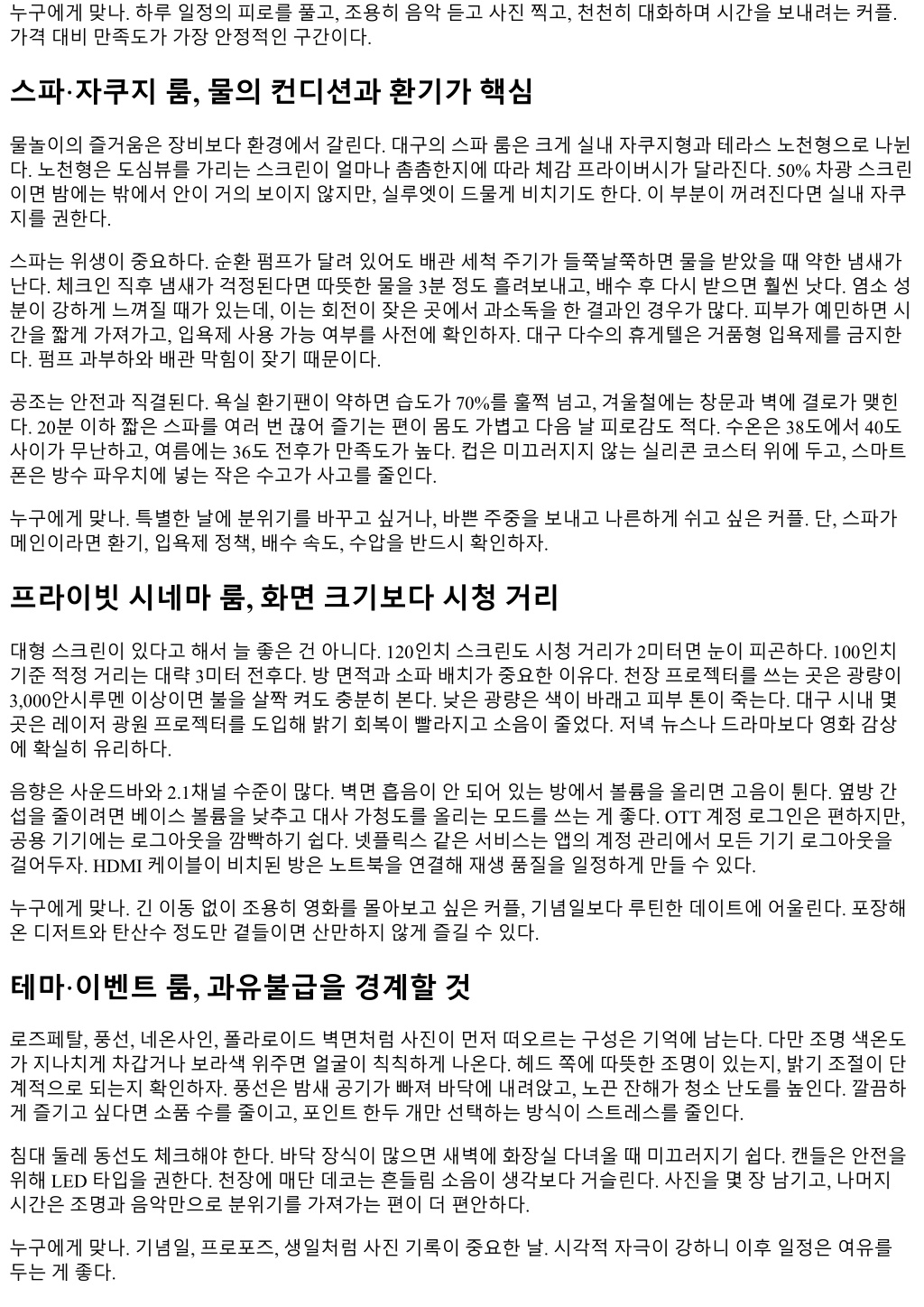 누구에게맞나. 하루일정의피로를풀고, 조용히음악듣고사진찍고, 천천히대화하며시간을보내려는커플. 가격대비만족도가가장안정적인구간이다. 스파·자쿠지룸, 물의컨디션과환기가핵심 물놀이의즐거움은장비보다환경에서갈린다. 대구의스파룸은크게실내자쿠지형과테라스노천형으로나뉜 다. 노천형은도심뷰를가리는스크린이얼마나촘촘한지에따라체감프라이버시가달라진다. 50% 차광스크린 이면밤에는밖에서안이거의보이지않지만, 실루엣이드물게비치기도한다. 이부분이꺼려진다면실내자쿠 지를권한다. 스파는위생이중요하다. 순환펌프가달려있어도배관세척주기가들쭉날쭉하면물을받았을때약한냄새가 난다. 체크인직후냄새가걱정된다면따뜻한물을 3분정도흘려보내고, 배수후다시받으면훨씬낫다. 염소성 분이강하게느껴질때가있는데, 이는회전이잦은곳에서과소독을한결과인경우가많다. 피부가예민하면시 간을짧게가져가고, 입욕제사용가능여부를사전에확인하자. 대구다수의휴게텔은거품형입욕제를금지한 다. 펌프과부하와배관막힘이잦기때문이다. 공조는안전과직결된다. 욕실환기팬이약하면습도가 70%를훌쩍넘고, 겨울철에는창문과벽에결로가맺힌 다. 20분이하짧은스파를여러번끊어즐기는편이몸도가볍고다음날피로감도적다. 수온은 38도에서 40도 사이가무난하고, 여름에는 36도전후가만족도가높다. 컵은미끄러지지않는실리콘코스터위에두고, 스마트 폰은방수파우치에넣는작은수고가사고를줄인다. 누구에게맞나. 특별한날에분위기를바꾸고싶거나, 바쁜주중을보내고나른하게쉬고싶은커플. 단, 스파가 메인이라면환기, 입욕제정책, 배수속도, 수압을반드시확인하자. 프라이빗시네마룸, 화면크기보다시청거리 대형스크린이있다고해서늘좋은건아니다. 120인치스크린도시청거리가 2미터면눈이피곤하다. 100인치 기준적정거리는대략 3미터전후다. 방면적과소파배치가중요한이유다. 천장프로젝터를쓰는곳은광량이 3,000안시루멘이상이면불을살짝켜도충분히본다. 낮은광량은색이바래고피부톤이죽는다. 대구시내몇 곳은레이저광원프로젝터를도입해밝기회복이빨라지고소음이줄었다. 저녁뉴스나드라마보다영화감상 에확실히유리하다. 음향은사운드바와 2.1채널수준이많다. 벽면흡음이안되어있는방에서볼륨을올리면고음이튄다. 옆방간 섭을줄이려면베이스볼륨을낮추고대사가청도를올리는모드를쓰는게좋다. OTT 계정로그인은편하지만, 공용기기에는로그아웃을깜빡하기쉽다. 넷플릭스같은서비스는앱의계정관리에서모든기기로그아웃을 걸어두자. HDMI 케이블이비치된방은노트북을연결해재생품질을일정하게만들수있다. 누구에게맞나. 긴이동없이조용히영화를몰아보고싶은커플, 기념일보다루틴한데이트에어울린다. 포장해 온디저트와탄산수정도만곁들이면산만하지않게즐길수있다. 테마·이벤트룸, 과유불급을경계할것 로즈페탈, 풍선, 네온사인, 폴라로이드벽면처럼사진이먼저떠오르는구성은기억에남는다. 다만조명색온도 가지나치게차갑거나보라색위주면얼굴이칙칙하게나온다. 헤드쪽에따뜻한조명이있는지, 밝기조절이단 계적으로되는지확인하자. 풍선은밤새공기가빠져바닥에내려앉고, 노끈잔해가청소난도를높인다. 깔끔하 게즐기고싶다면소품수를줄이고, 포인트한두개만선택하는방식이스트레스를줄인다. 침대둘레동선도체크해야한다. 바닥장식이많으면새벽에화장실다녀올때미끄러지기쉽다. 캔들은안전을 위해 LED 타입을권한다. 천장에매단데코는흔들림소음이생각보다거슬린다. 사진을몇장남기고, 나머지 시간은조명과음악만으로분위기를가져가는편이더편안하다. 누구에게맞나. 기념일, 프로포즈, 생일처럼사진기록이중요한날. 시각적자극이강하니이후일정은여유를 두는게좋다.