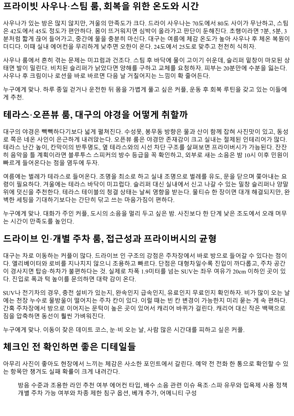 프라이빗사우나·스팀룸, 회복을위한온도와시간 사우나가있는방은많지않지만, 겨울의만족도가크다. 드라이사우나는 70도에서 80도사이가무난하고, 스팀 은 42도에서 45도정도가편안하다. 몸이뜨거워지면심박이올라가고판단이둔해진다. 초행이라면 7분, 5분, 3 분처럼짧게끊어들어가고, 중간에물을충분히마신다. 대구는여름에체감온도가높아사우나후체온복원이 더디다. 이때실내에어컨을무리하게낮추면오한이온다. 24도에서 25도로맞추고천천히식히자. 사우나룸에서흔히겪는문제는미끄럼과건조다. 스팀후바닥에물이고이기쉬운데, 슬리퍼밑창이마모된상 태면발이밀린다. 비치된슬리퍼가낡았다면양해를구하고교체를요청하자. 피부는 20분만에수분을잃는다. 사우나후크림이나로션을바로바르면다음날거칠어지는느낌이확줄어든다. 누구에게맞나. 하루종일걷거나운전한뒤몸을가볍게풀고싶은커플, 운동후회복루틴을갖고있는이들에 게추천. 테라스·오픈뷰룸, 대구의야경을어떻게취할까 대구의야경은빽빽하다기보다넓게펼쳐진다. 수성못, 봉무동방향은물과산이함께잡혀사진맛이있고, 동성 로쪽은네온사인이은근하게내려앉는다. 오픈뷰룸은야경만존재감이크고실내는절제된인테리어가많다. 테라스난간높이, 칸막이의반투명도, 옆테라스와의시선차단구조를살펴보면프라이버시가가늠된다. 잔잔 히음악을틀계획이라면블루투스스피커의방수등급을꼭확인하고, 외부로새는소음은밤 10시이후민원이 빠르게들어온다는점을염두에두자. 여름에는벌레가테라스로들어온다. 조명을최소로하고실내조명으로벌레를유도, 문을닫으며쫓아내는요 령이필요하다. 겨울에는테라스바닥이미끄럽다. 슬리퍼대신실내에서신고나갈수있는밀창슬리퍼나양말 위에덧신을추천한다. 테라스테이블의청결상태는날씨영향을받는다. 물티슈한장이면대개해결되지만, 완 벽한세팅을기대하기보다는간단히닦고쓰는마음가짐이편하다. 누구에게맞나. 대화가주인커플, 도시의소음을멀리두고싶은밤. 사진보다한단계낮은조도에서오래머무 는시간이만족도를높인다. 드라이브인·개별주차룸, 접근성과프라이버시의균형 대구는차로이동하는커플이많다. 드라이브인구조의강점은주차장에서바로방으로들어갈수있다는점이 다. 엘리베이터와로비를지나치지않으니조용하고빠르다. 단점은대형차일수록진입이까다롭고, 주차공간 이경사지면탑승·하차가불편하다는것. 실제로차폭 1.9미터를넘는 SUV는좌우여유가 20cm 이하인곳이있 다. 진입로폭과턱높이를문의하면대략감이온다. SUV나전기차의경우, 충전설비가있는지, 완속인지급속인지, 유료인지무료인지확인하자. 비가많이오는날 에는천장누수로물방울이떨어지는주차칸이있다. 이럴때는빈칸변경이가능한지미리묻는게속편하다. 간혹주차장에서방으로이어지는문턱이높은곳이있어서캐리어바퀴가걸린다. 캐리어대신작은백팩으로 짐을압축하면동선이훨씬가벼워진다. 누구에게맞나. 이동이잦은데이트코스, 눈·비오는날, 사람많은시간대를피하고싶은커플. 체크인전확인하면좋은디테일들 아무리사진이좋아도현장에서느끼는체감은사소한포인트에서갈린다. 예약전전화한통으로확인할수있 는항목만챙겨도실패확률이크게내려간다. 방음수준과조용한라인추천여부에어컨타입, 배수소음관련이슈욕조·스파유무와입욕제사용정책 개별주차가능여부와차종제한침구옵션, 베개추가, 어메니티구성