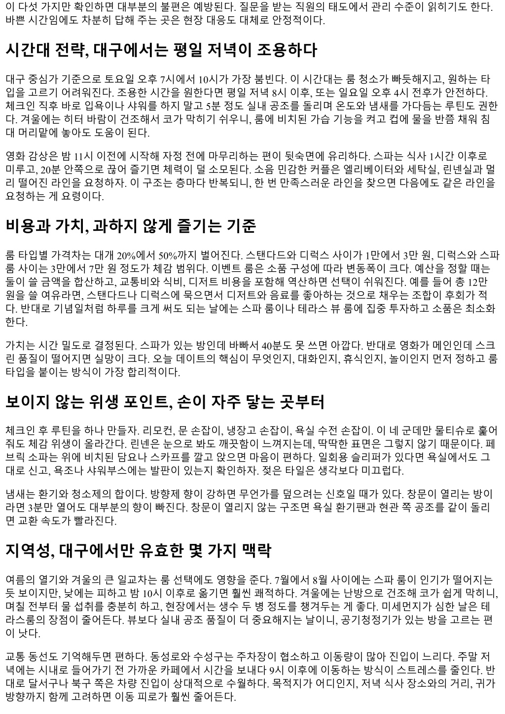 이다섯가지만확인하면대부분의불편은예방된다. 질문을받는직원의태도에서관리수준이읽히기도한다. 바쁜시간임에도차분히답해주는곳은현장대응도대체로안정적이다. 시간대전략, 대구에서는평일저녁이조용하다 대구중심가기준으로토요일오후 7시에서 10시가가장붐빈다. 이시간대는룸청소가빠듯해지고, 원하는타 입을고르기어려워진다. 조용한시간을원한다면평일저녁 8시이후, 또는일요일오후 4시전후가안전하다. 체크인직후바로입욕이나샤워를하지말고 5분정도실내공조를돌리며온도와냄새를가다듬는루틴도권한 다. 겨울에는히터바람이건조해서코가막히기쉬우니, 룸에비치된가습기능을켜고컵에물을반쯤채워침 대머리맡에놓아도도움이된다. 영화감상은밤 11시이전에시작해자정전에마무리하는편이뒷숙면에유리하다. 스파는식사 1시간이후로 미루고, 20분안쪽으로끊어즐기면체력이덜소모된다. 소음민감한커플은엘리베이터와세탁실, 린넨실과멀 리떨어진라인을요청하자. 이구조는층마다반복되니, 한번만족스러운라인을찾으면다음에도같은라인을 요청하는게요령이다. 비용과가치, 과하지않게즐기는기준 룸타입별가격차는대개 20%에서 50%까지벌어진다. 스탠다드와디럭스사이가 1만에서 3만원, 디럭스와스파 룸사이는 3만에서 7만원정도가체감범위다. 이벤트룸은소품구성에따라변동폭이크다. 예산을정할때는 둘이쓸금액을합산하고, 교통비와식비, 디저트비용을포함해역산하면선택이쉬워진다. 예를들어총 12만 원을쓸여유라면, 스탠다드나디럭스에묵으면서디저트와음료를좋아하는것으로채우는조합이후회가적 다. 반대로기념일처럼하루를크게써도되는날에는스파룸이나테라스뷰룸에집중투자하고소품은최소화 한다. 가치는시간밀도로결정된다. 스파가있는방인데바빠서 40분도못쓰면아깝다. 반대로영화가메인인데스크 린품질이떨어지면실망이크다. 오늘데이트의핵심이무엇인지, 대화인지, 휴식인지, 놀이인지먼저정하고룸 타입을붙이는방식이가장합리적이다. 보이지않는위생포인트, 손이자주닿는곳부터 체크인후루틴을하나만들자. 리모컨, 문손잡이, 냉장고손잡이, 욕실수전손잡이. 이네군데만물티슈로훑어 줘도체감위생이올라간다. 린넨은눈으로봐도깨끗함이느껴지는데, 딱딱한표면은그렇지않기때문이다. 페 브릭소파는위에비치된담요나스카프를깔고앉으면마음이편하다. 일회용슬리퍼가있다면욕실에서도그 대로신고, 욕조나샤워부스에는발판이있는지확인하자. 젖은타일은생각보다미끄럽다. 냄새는환기와청소제의합이다. 방향제향이강하면무언가를덮으려는신호일때가있다. 창문이열리는방이 라면 3분만열어도대부분의향이빠진다. 창문이열리지않는구조면욕실환기팬과현관쪽공조를같이돌리 면교환속도가빨라진다. 지역성, 대구에서만유효한몇가지맥락 여름의열기와겨울의큰일교차는룸선택에도영향을준다. 7월에서 8월사이에는스파룸이인기가떨어지는 듯보이지만, 낮에는피하고밤 10시이후로옮기면훨씬쾌적하다. 겨울에는난방으로건조해코가쉽게막히니, 며칠전부터물섭취를충분히하고, 현장에서는생수두병정도를챙겨두는게좋다. 미세먼지가심한날은테 라스룸의장점이줄어든다. 뷰보다실내공조품질이더중요해지는날이니, 공기청정기가있는방을고르는편 이낫다. 교통동선도기억해두면편하다. 동성로와수성구는주차장이협소하고이동량이많아진입이느리다. 주말저 녁에는시내로들어가기전가까운카페에서시간을보내다 9시이후에이동하는방식이스트레스를줄인다. 반 대로달서구나북구쪽은차량진입이상대적으로수월하다. 목적지가어디인지, 저녁식사장소와의거리, 귀가 방향까지함께고려하면이동피로가훨씬줄어든다.