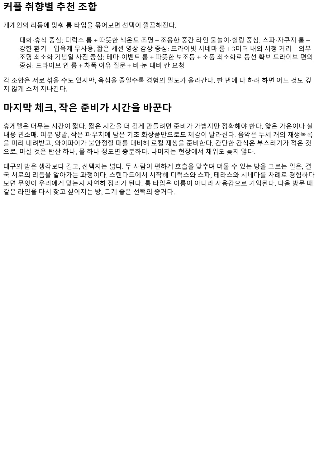 커플취향별추천조합 개개인의리듬에맞춰룸타입을묶어보면선택이깔끔해진다. 대화·휴식중심: 디럭스룸 + 따뜻한색온도조명 + 조용한중간라인물놀이·힐링중심: 스파·자쿠지룸 + 강한환기 + 입욕제무사용, 짧은세션영상감상중심: 프라이빗시네마룸 + 3미터내외시청거리 + 외부 조명최소화기념일사진중심: 테마·이벤트룸 + 따뜻한보조등 + 소품최소화로동선확보드라이브편의 중심: 드라이브인룸 + 차폭여유질문 + 비·눈대비칸요청 각조합은서로섞을수도있지만, 욕심을줄일수록경험의밀도가올라간다. 한번에다하려하면어느것도깊 지않게스쳐지나간다. 마지막체크, 작은준비가시간을바꾼다 휴게텔은머무는시간이짧다. 짧은시간을더깊게만들려면준비가가볍지만정확해야한다. 얇은가운이나실 내용민소매, 여분양말, 작은파우치에담은기초화장품만으로도체감이달라진다. 음악은두세개의재생목록 을미리내려받고, 와이파이가불안정할때를대비해로컬재생을준비한다. 간단한간식은부스러기가적은것 으로, 마실것은탄산하나, 물하나정도면충분하다. 나머지는현장에서채워도늦지않다. 대구의밤은생각보다길고, 선택지는넓다. 두사람이편하게호흡을맞추며머물수있는방을고르는일은, 결 국서로의리듬을알아가는과정이다. 스탠다드에서시작해디럭스와스파, 테라스와시네마를차례로경험하다 보면무엇이우리에게맞는지자연히정리가된다. 룸타입은이름이아니라사용감으로기억된다. 다음방문때 같은라인을다시찾고싶어지는방, 그게좋은선택의증거다.
