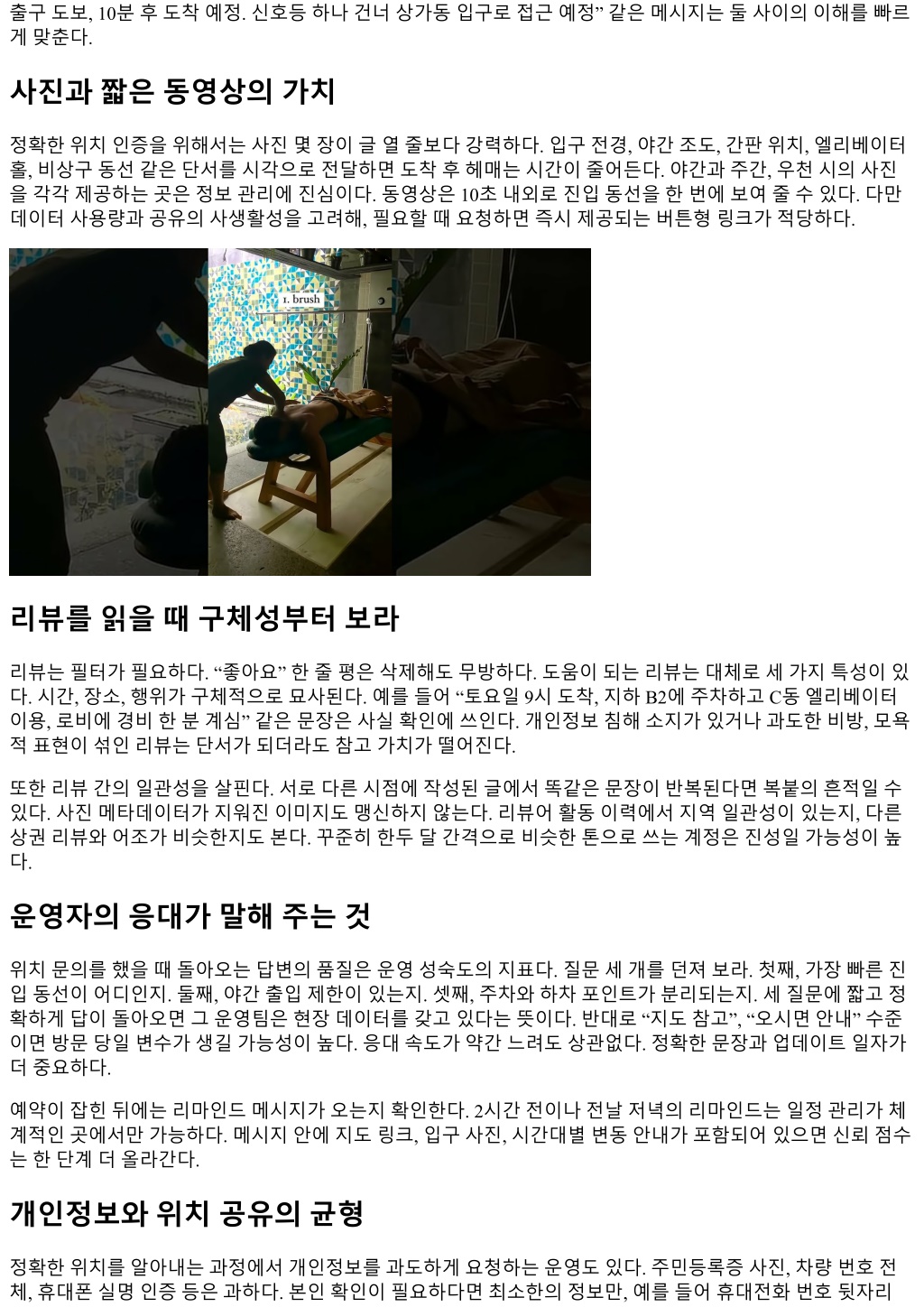 출구도보, 10분후도착예정. 신호등하나건너상가동입구로접근예정” 같은메시지는둘사이의이해를빠르 게맞춘다. 사진과짧은동영상의가치 정확한위치인증을위해서는사진몇장이글열줄보다강력하다. 입구전경, 야간조도, 간판위치, 엘리베이터 홀, 비상구동선같은단서를시각으로전달하면도착후헤매는시간이줄어든다. 야간과주간, 우천시의사진 을각각제공하는곳은정보관리에진심이다. 동영상은 10초내외로진입동선을한번에보여줄수있다. 다만 데이터사용량과공유의사생활성을고려해, 필요할때요청하면즉시제공되는버튼형링크가적당하다. 리뷰를읽을때구체성부터보라 리뷰는필터가필요하다. “좋아요” 한줄평은삭제해도무방하다. 도움이되는리뷰는대체로세가지특성이있 다. 시간, 장소, 행위가구체적으로묘사된다. 예를들어 “토요일 9시도착, 지하 B2에주차하고 C동엘리베이터 이용, 로비에경비한분계심” 같은문장은사실확인에쓰인다. 개인정보침해소지가있거나과도한비방, 모욕 적표현이섞인리뷰는단서가되더라도참고가치가떨어진다. 또한리뷰간의일관성을살핀다. 서로다른시점에작성된글에서똑같은문장이반복된다면복붙의흔적일수 있다. 사진메타데이터가지워진이미지도맹신하지않는다. 리뷰어활동이력에서지역일관성이있는지, 다른 상권리뷰와어조가비슷한지도본다. 꾸준히한두달간격으로비슷한톤으로쓰는계정은진성일가능성이높 다. 운영자의응대가말해주는것 위치문의를했을때돌아오는답변의품질은운영성숙도의지표다. 질문세개를던져보라. 첫째, 가장빠른진 입동선이어디인지. 둘째, 야간출입제한이있는지. 셋째, 주차와하차포인트가분리되는지. 세질문에짧고정 확하게답이돌아오면그운영팀은현장데이터를갖고있다는뜻이다. 반대로 “지도참고”, “오시면안내” 수준 이면방문당일변수가생길가능성이높다. 응대속도가약간느려도상관없다. 정확한문장과업데이트일자가 더중요하다. 예약이잡힌뒤에는리마인드메시지가오는지확인한다. 2시간전이나전날저녁의리마인드는일정관리가체 계적인곳에서만가능하다. 메시지안에지도링크, 입구사진, 시간대별변동안내가포함되어있으면신뢰점수 는한단계더올라간다. 개인정보와위치공유의균형 정확한위치를알아내는과정에서개인정보를과도하게요청하는운영도있다. 주민등록증사진, 차량번호전 체, 휴대폰실명인증등은과하다. 본인확인이필요하다면최소한의정보만, 예를들어휴대전화번호뒷자리