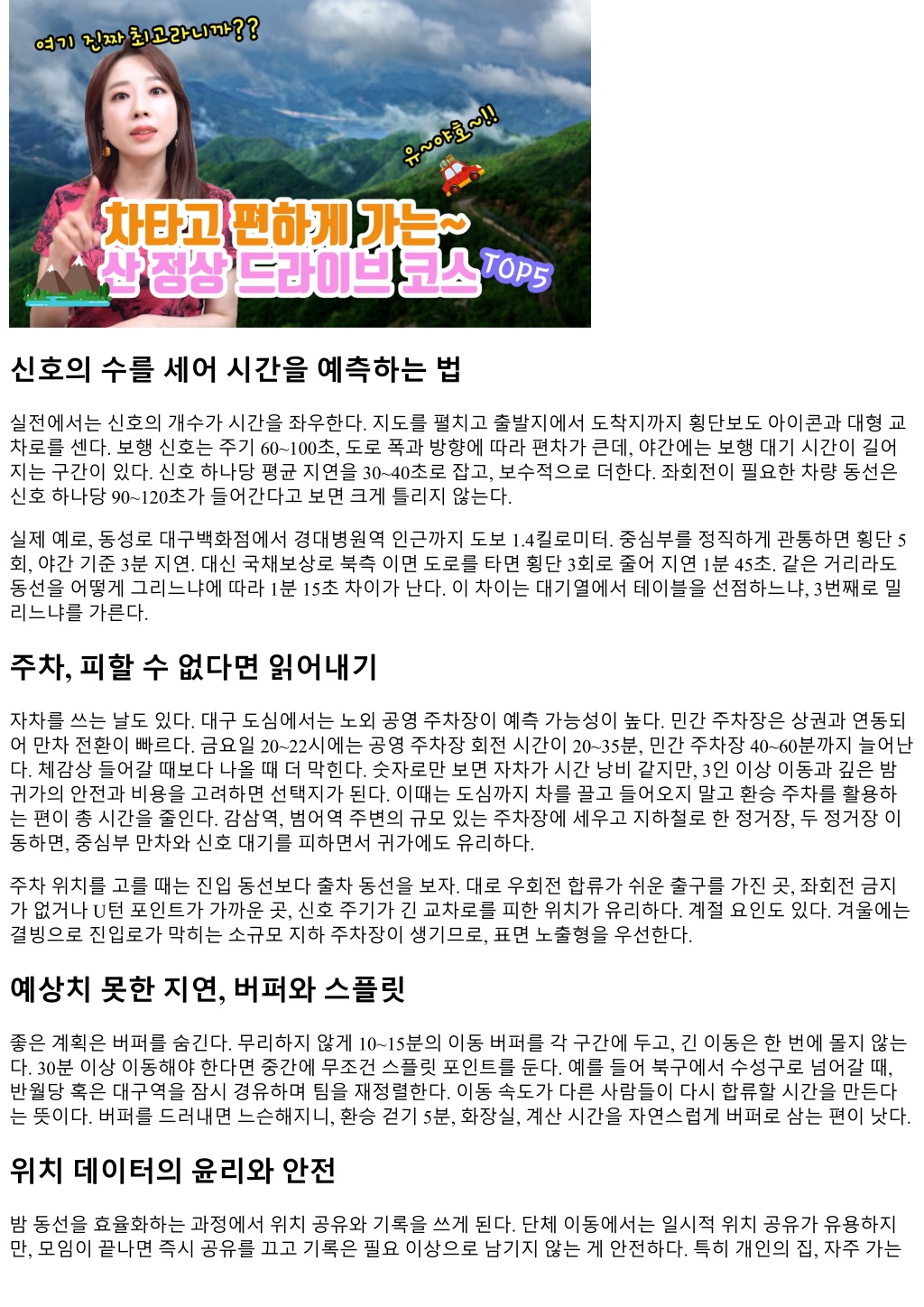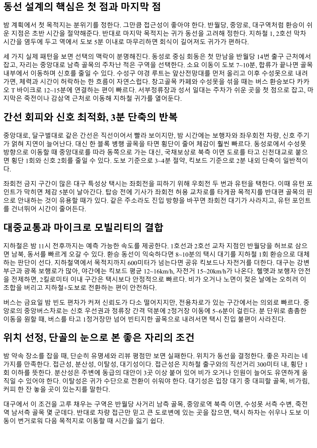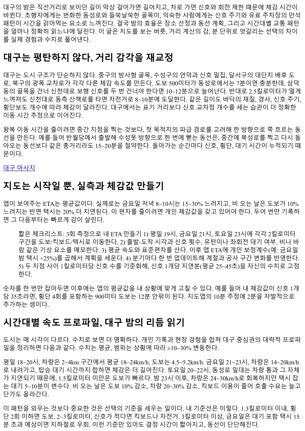 오랜시행착오끝에정착한개인규칙을공유한다. 1킬로미터당신호 3개이상이면도보속도는 4.2km/h로보정 한다. 금요일 21~23시택시호출은대기 6~12분을기본에더한다. 좌회전 2회이상의차량동선은지하철로전환 검토. 킥보드는비가오기시작하면바로접고, 지하로내려가는시간을포함하더라도안전을우선한다. 마지막 500미터는병행골목을 1회시도해보고, 군중밀도가높으면즉시원래경로로복귀한다. 귀가가 00시를넘으면 환승없이집방향직선노선을우선선택한다. 규칙은각자다르게만들어지겠지만, 숫자로고정해야흔들리지않는다. 한번정하면동선설계가빨라진다. 메 뉴보다먼저길을정하고, 시간보다먼저신호를센다. 대구의밤을최적화한다는것 최적화는더많이가는것이아니다. 덜헤매고, 덜기다리고, 덜피곤해지는것이다. 결과적으로더많이즐길수 있다는뜻이기도하다. 위치선택으로혼잡을비껴가고, 거리계산으로불필요한왕복을없애고, 신호와시간대 를읽어몸이원하는속도로움직이면, 대구의밤은더넓어진다. 좁은골목, 넓은대로, 강변의바람, 사람들의발 걸음이서로다른리듬으로움직인다. 그리듬을타려면숫자와감각을함께쓴다. 지도는시작이고, 발걸음이완 성한다. 오늘밤어디로갈지정했다면, 첫걸음을어디에찍을지부터생각하자. 방향만맞으면시간은자연히아 군이된다.