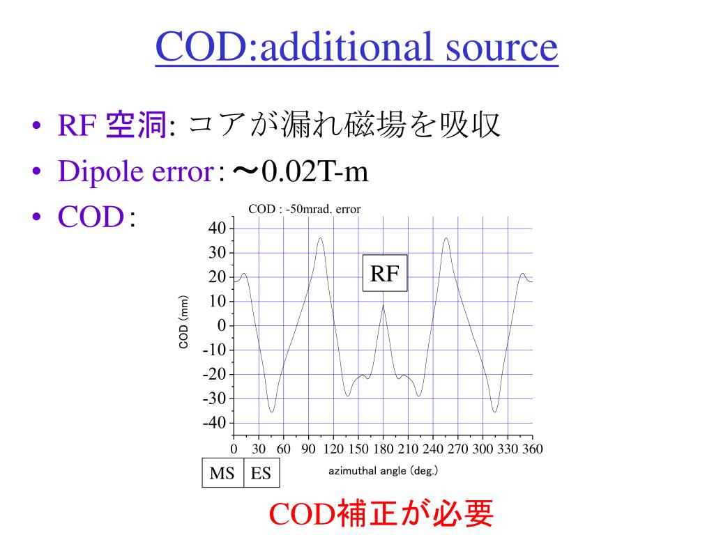 COD:additional source • RF 空洞: コアが漏れ磁場を吸収 • Dipole error:~0.02T-m • COD: RF MS ES COD補正が必要