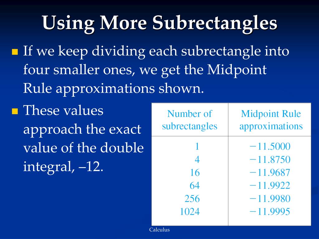 Using More Subrectangles • If we keep dividing each subrectangle into four smaller ones, we get the Midpoint Rule approximations shown. • These valuesapproach the exactvalue of the doubleintegral, –12. Calculus