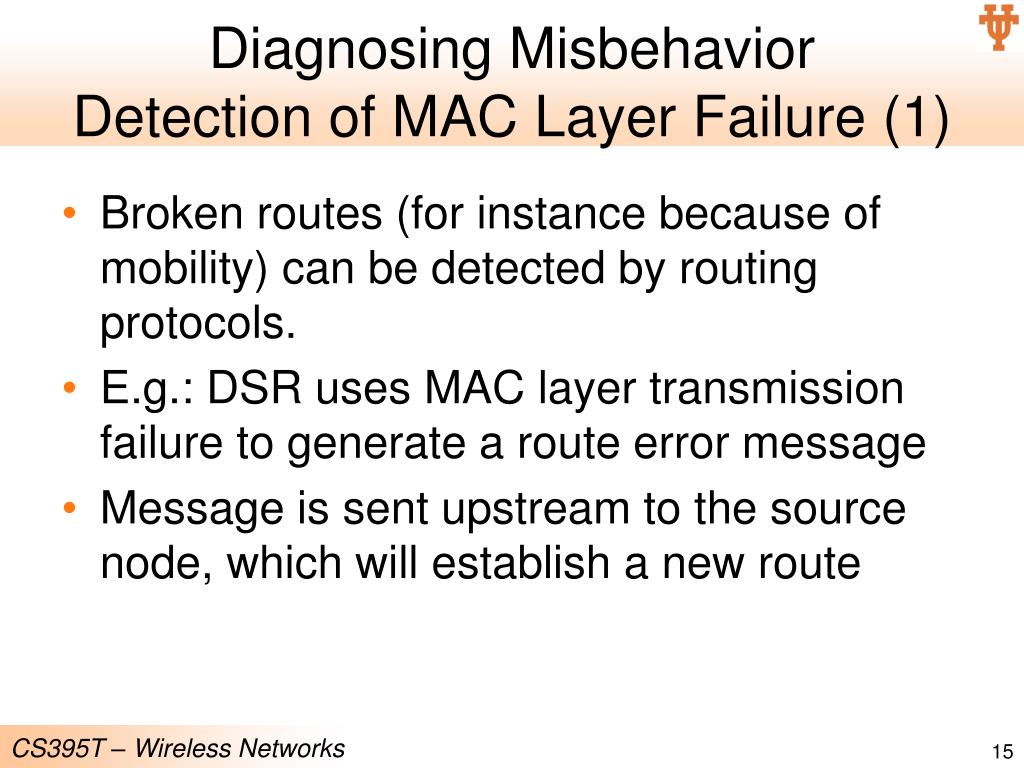 Diagnosing MisbehaviorDetection of MAC Layer Failure (1) • Broken routes (for instance because of mobility) can be detected by routing protocols. • E.g.: DSR uses MAC layer transmission failure to generate a route error message • Message is sent upstream to the source node, which will establish a new route