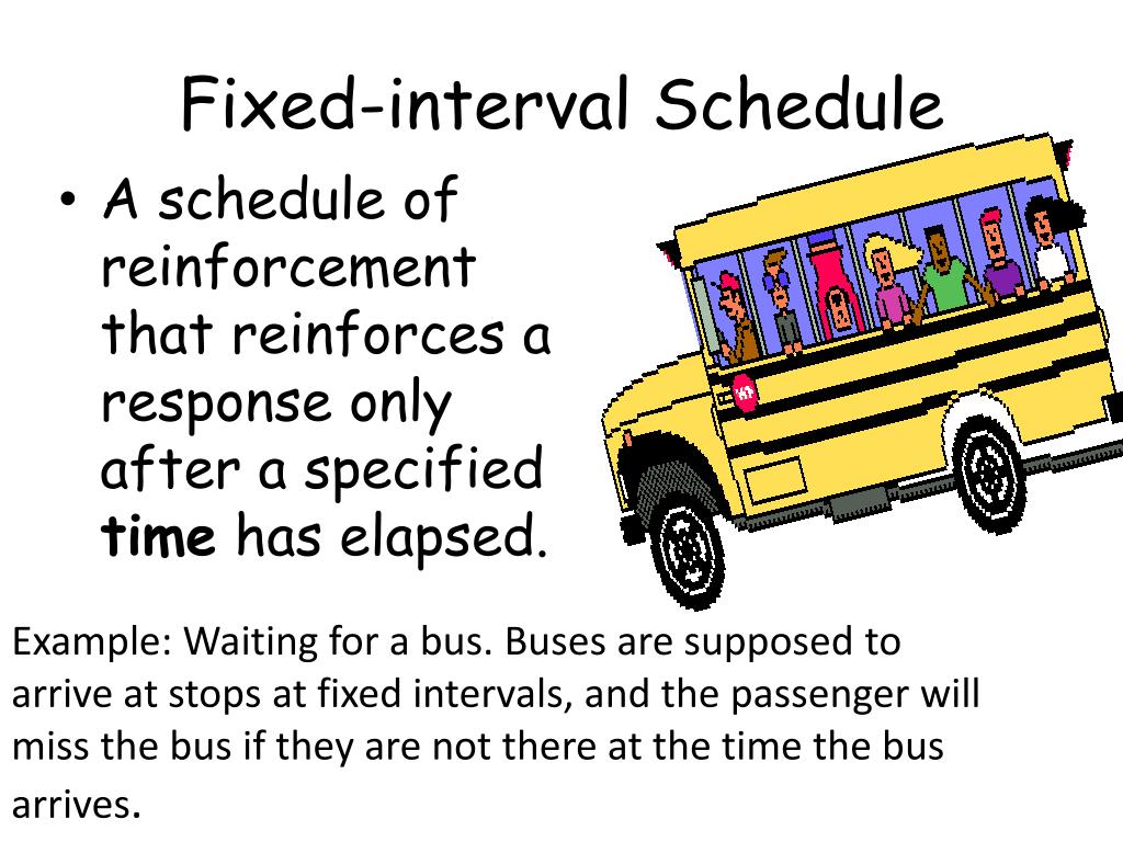 Fixed-interval Schedule • A schedule of reinforcement that reinforces a response only after a specified time has elapsed. Example: Waiting for a bus. Buses are supposed to arrive at stops at fixed intervals, and the passenger will miss the bus if they are not there at the time the bus arrives.