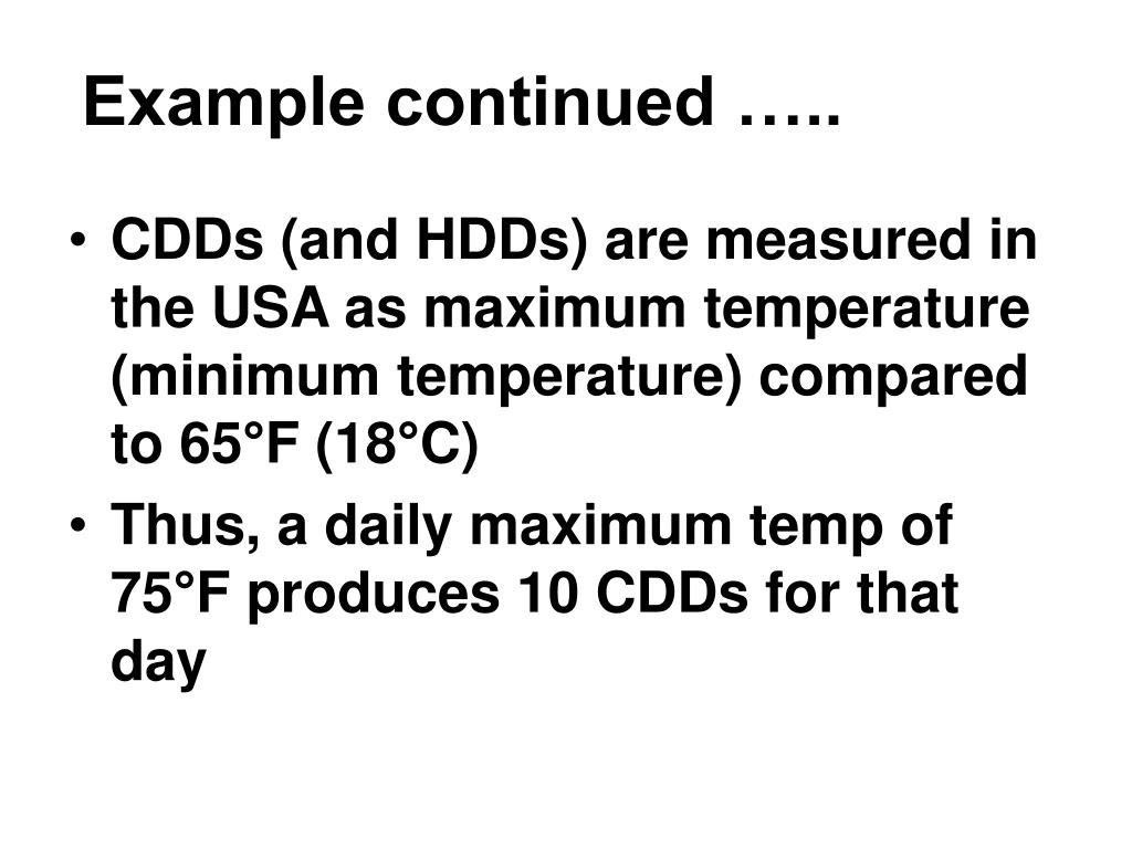 Example continued ….. • CDDs (and HDDs) are measured in the USA as maximum temperature (minimum temperature) compared to 65°F (18°C) • Thus, a daily maximum temp of 75°F produces 10 CDDs for that day