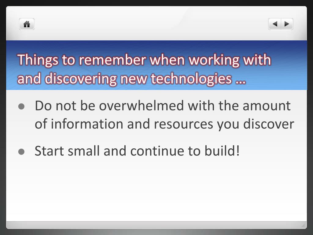 Things to remember when working with and discovering new technologies … • Do not be overwhelmed with the amount of information and resources you discover • Start small and continue to build!