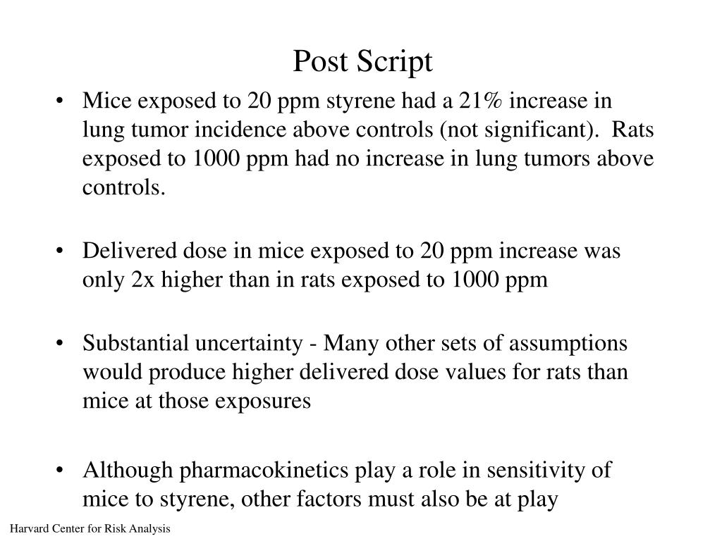 Post Script • Mice exposed to 20 ppm styrene had a 21% increase in lung tumor incidence above controls (not significant). Rats exposed to 1000 ppm had no increase in lung tumors above controls. • Delivered dose in mice exposed to 20 ppm increase was only 2x higher than in rats exposed to 1000 ppm • Substantial uncertainty - Many other sets of assumptions would produce higher delivered dose values for rats than mice at those exposures • Although pharmacokinetics play a role in sensitivity of mice to styrene, other factors must also be at play Harvard Center for Risk Analysis