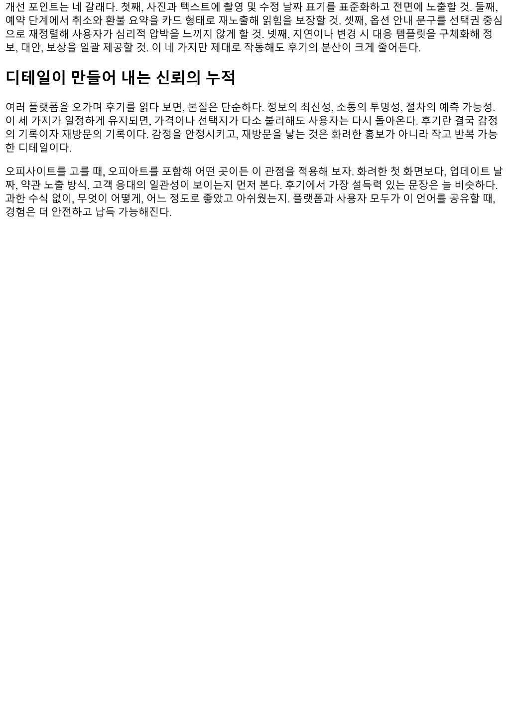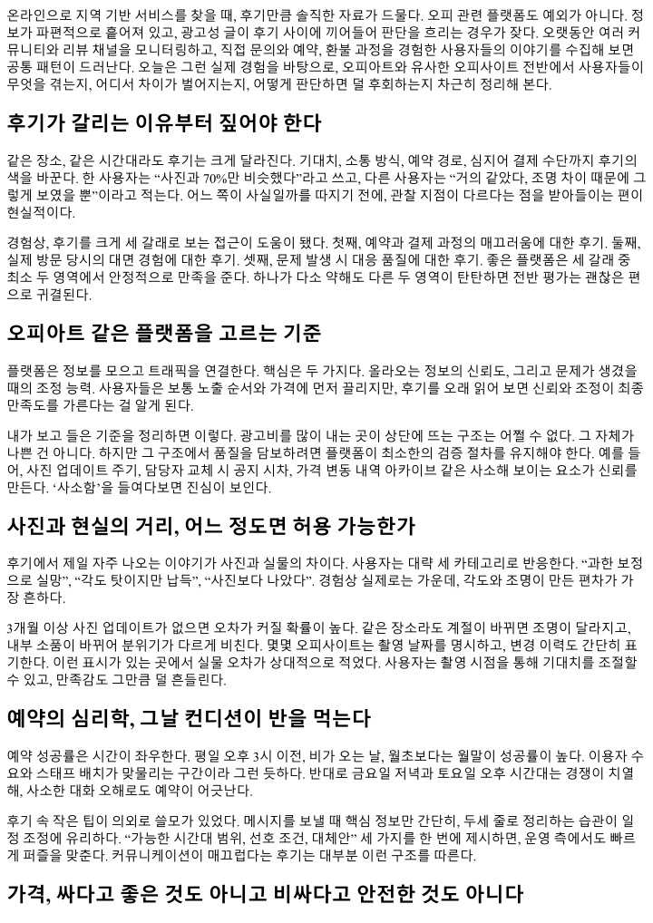 개선포인트는네갈래다. 첫째, 사진과텍스트에촬영및수정날짜표기를표준화하고전면에노출할것. 둘째, 예약단계에서취소와환불요약을카드형태로재노출해읽힘을보장할것. 셋째, 옵션안내문구를선택권중심 으로재정렬해사용자가심리적압박을느끼지않게할것. 넷째, 지연이나변경시대응템플릿을구체화해정 보, 대안, 보상을일괄제공할것. 이네가지만제대로작동해도후기의분산이크게줄어든다. 디테일이만들어내는신뢰의누적 여러플랫폼을오가며후기를읽다보면, 본질은단순하다. 정보의최신성, 소통의투명성, 절차의예측가능성. 이세가지가일정하게유지되면, 가격이나선택지가다소불리해도사용자는다시돌아온다. 후기란결국감정 의기록이자재방문의기록이다. 감정을안정시키고, 재방문을낳는것은화려한홍보가아니라작고반복가능 한디테일이다. 오피사이트를고를때, 오피아트를포함해어떤곳이든이관점을적용해보자. 화려한첫화면보다, 업데이트날 짜, 약관노출방식, 고객응대의일관성이보이는지먼저본다. 후기에서가장설득력있는문장은늘비슷하다. 과한수식없이, 무엇이어떻게, 어느정도로좋았고아쉬웠는지. 플랫폼과사용자모두가이언어를공유할때, 경험은더안전하고납득가능해진다.