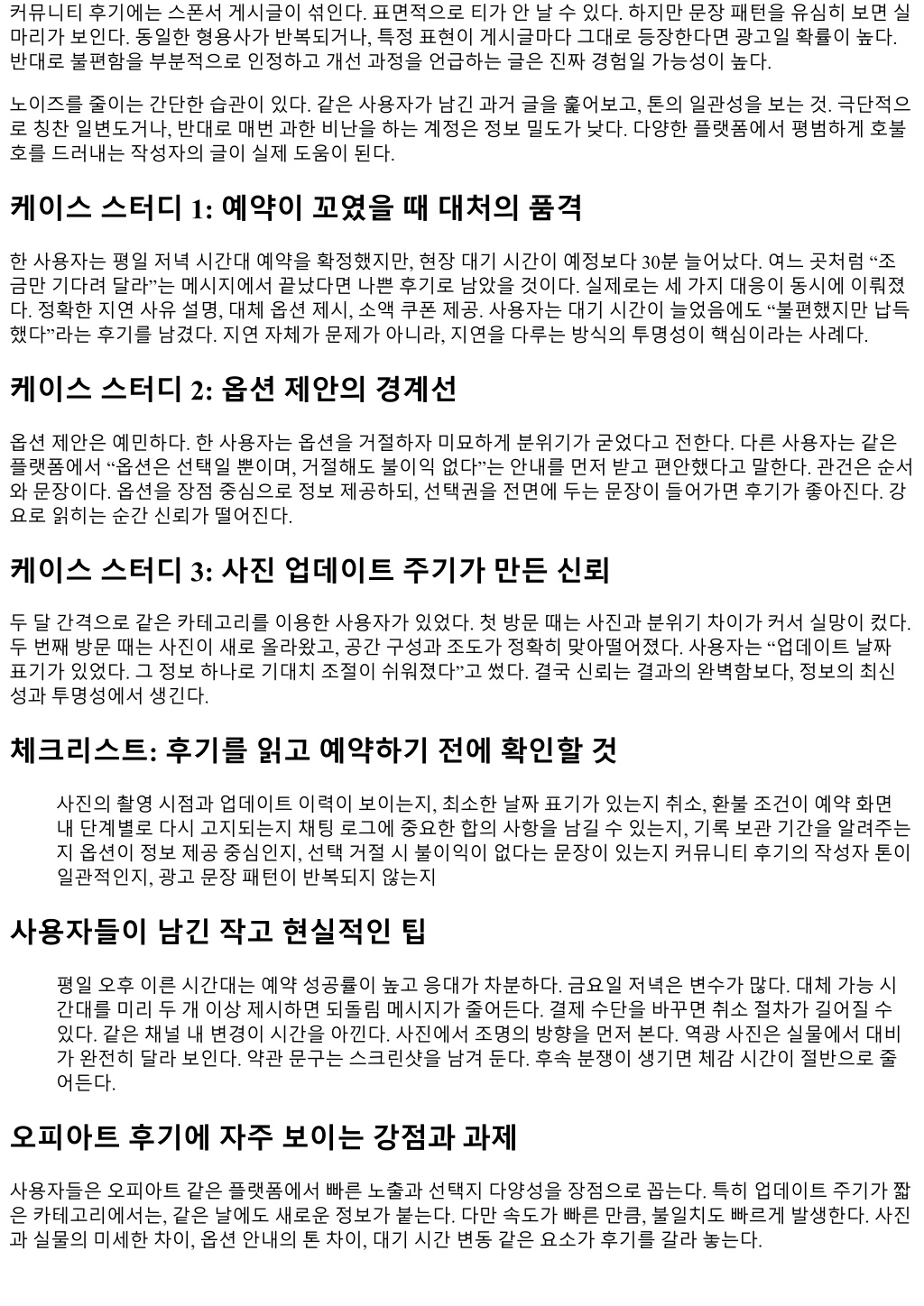 커뮤니티후기에는스폰서게시글이섞인다. 표면적으로티가안날수있다. 하지만문장패턴을유심히보면실 마리가보인다. 동일한형용사가반복되거나, 특정표현이게시글마다그대로등장한다면광고일확률이높다. 반대로불편함을부분적으로인정하고개선과정을언급하는글은진짜경험일가능성이높다. 노이즈를줄이는간단한습관이있다. 같은사용자가남긴과거글을훑어보고, 톤의일관성을보는것. 극단적으 로칭찬일변도거나, 반대로매번과한비난을하는계정은정보밀도가낮다. 다양한플랫폼에서평범하게호불 호를드러내는작성자의글이실제도움이된다. 케이스스터디 1: 예약이꼬였을때대처의품격 한사용자는평일저녁시간대예약을확정했지만, 현장대기시간이예정보다 30분늘어났다. 여느곳처럼 “조 금만기다려달라”는메시지에서끝났다면나쁜후기로남았을것이다. 실제로는세가지대응이동시에이뤄졌 다. 정확한지연사유설명, 대체옵션제시, 소액쿠폰제공. 사용자는대기시간이늘었음에도 “불편했지만납득 했다”라는후기를남겼다. 지연자체가문제가아니라, 지연을다루는방식의투명성이핵심이라는사례다. 케이스스터디 2: 옵션제안의경계선 옵션제안은예민하다. 한사용자는옵션을거절하자미묘하게분위기가굳었다고전한다. 다른사용자는같은 플랫폼에서 “옵션은선택일뿐이며, 거절해도불이익없다”는안내를먼저받고편안했다고말한다. 관건은순서 와문장이다. 옵션을장점중심으로정보제공하되, 선택권을전면에두는문장이들어가면후기가좋아진다. 강 요로읽히는순간신뢰가떨어진다. 케이스스터디 3: 사진업데이트주기가만든신뢰 두달간격으로같은카테고리를이용한사용자가있었다. 첫방문때는사진과분위기차이가커서실망이컸다. 두번째방문때는사진이새로올라왔고, 공간구성과조도가정확히맞아떨어졌다. 사용자는 “업데이트날짜 표기가있었다. 그정보하나로기대치조절이쉬워졌다”고썼다. 결국신뢰는결과의완벽함보다, 정보의최신 성과투명성에서생긴다. 체크리스트: 후기를읽고예약하기전에확인할것 사진의촬영시점과업데이트이력이보이는지, 최소한날짜표기가있는지취소, 환불조건이예약화면 내단계별로다시고지되는지채팅로그에중요한합의사항을남길수있는지, 기록보관기간을알려주는 지옵션이정보제공중심인지, 선택거절시불이익이없다는문장이있는지커뮤니티후기의작성자톤이 일관적인지, 광고문장패턴이반복되지않는지 사용자들이남긴작고현실적인팁 평일오후이른시간대는예약성공률이높고응대가차분하다. 금요일저녁은변수가많다. 대체가능시 간대를미리두개이상제시하면되돌림메시지가줄어든다. 결제수단을바꾸면취소절차가길어질수 있다. 같은채널내변경이시간을아낀다. 사진에서조명의방향을먼저본다. 역광사진은실물에서대비 가완전히달라보인다. 약관문구는스크린샷을남겨둔다. 후속분쟁이생기면체감시간이절반으로줄 어든다. 오피아트후기에자주보이는강점과과제 사용자들은오피아트같은플랫폼에서빠른노출과선택지다양성을장점으로꼽는다. 특히업데이트주기가짧 은카테고리에서는, 같은날에도새로운정보가붙는다. 다만속도가빠른만큼, 불일치도빠르게발생한다. 사진 과실물의미세한차이, 옵션안내의톤차이, 대기시간변동같은요소가후기를갈라놓는다.