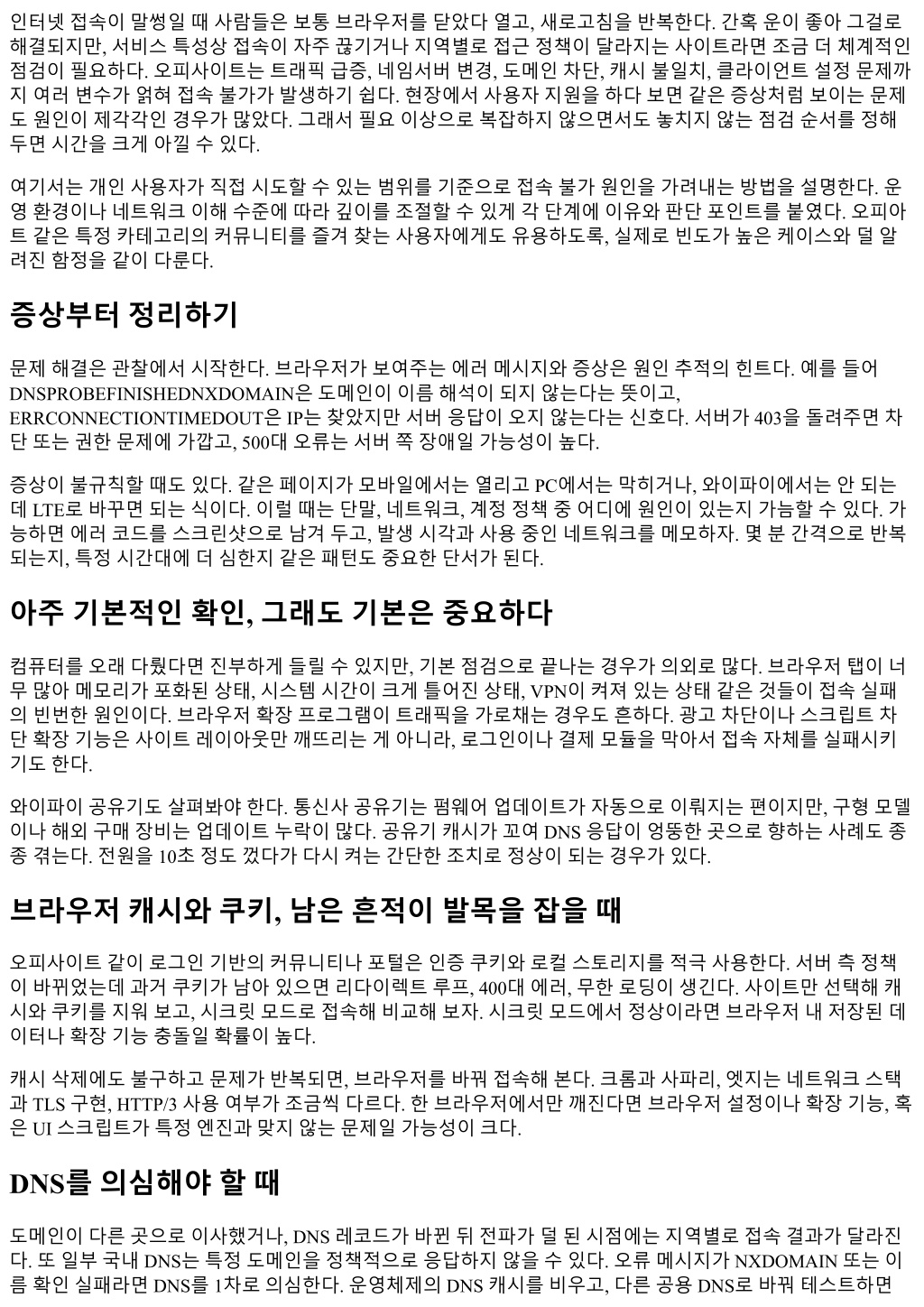 도움이된다. 모바일에서는 DNS 변경앱을활용할수있다. 체감상구글 8.8.8.8, 클라우드플레어 1.1.1.1, 넥슨 1.0.0.1 정도가응답품질이안정적이다. DNS가의심될때단순한핑테스트만으로는부족하다. 핑은 ICMP를쓰고, 일부서버는 ICMP를차단한다. 대신 nslookup 또는 dig로 A, AAAA, CNAME 레코드를확인해실제로어떤 IP를돌려받는지비교한다. 집과휴대폰, 회사망에서각각다른 IP로해석된다면 DNS 전파중이거나, 로컬네트워크의재귀 DNS가캐시를잘못들고있 을가능성이있다. 네트워크경로, 어딘가에서끊겼는지 타임아웃이잦고, 다른사이트는잘열리는데오피사이트만안된다면경로문제를살펴야한다. traceroute나 mtr 같은도구로경로를보면특정홉에서응답이계속끊어지는구간이보인다. 물론중간라우터가 ICMP 응답을차 단할수도있으니, 홉하나만끊기는건큰의미가없다. 다만특정구간이후로전부타임아웃이라면, 그지점에 장애가있거나필터링이적용되고있을가능성이크다. 휴대폰테더링으로바꿔접속해보고, 회사망에서안되는데집에서는된다면기업방화벽의정책도고려해야 한다. 반대로집에서는안되고 LTE에서는되는경우, 가정용공유기의보안기능또는통신사의도메인차단정 책이관여했을수있다. 통신사별정책은미세하게다르다. 같은도메인이 SKT에서는열리고 KT에서는안열리 는사례가가끔보고된다. 이런경우에는 DNS, 프록시, VPN 조합을바꿔보면서원인을좁히는수밖에없다. TLS와시간불일치 보안연결실패는종종컴퓨터의시스템시간이틀어져서발생한다. 인증서는유효기간이엄격하고, 몇분단위 의오차는괜찮지만몇시간또는하루이상틀어지면대부분의브라우저가인증서를거부한다. 해외서버의인 증서체인갱신직후, 로컬루트스토어갱신이늦어져중간인증서를못찾는경우도있다. 이때는다른브라우 저로접근해보거나운영체제업데이트를먼저적용하자. 루트인증서스토어는운영체제에묶여있고, 회사 PC 는정책에따라업데이트가지연되기도한다. 또하나, TLS 1.3을활성화한서버가구형클라이언트와호환되지않아접속이끊기는케이스가있다. 윈도우 7, 구형안드로이드기기에서특히발생한다. 가능하다면최신브라우저와운영체제로업데이트하고, 임시로 HTTP/3 사용을끄거나 QUIC를비활성화하면달라지는지확인해보자. 체감상 QUIC가불안정한네트워크에서 타임아웃을늘리는경우가있었다. VPN, 프록시, 광고차단의그림자 접속불가상담의 20% 이상은 VPN이나프록시가원인이었다. 사용자는 VPN을켠걸잊어버리기도하고, 일부 보안프로그램은백그라운드에서트래픽을프록시로우회한다. 서비스사업자는종종알려진 VPN IP 대역을차 단한다. 불법접속이나봇트래픽이많이들어오는구간을미리막아두기때문이다. VPN을끄고다시시도하자. 반대로, 지역제한이있는사이트라면 VPN을켰을때만열릴수도있다. 어느쪽이든켰을때와껐을때의차이 를관찰해야판단이선다. 광고차단도구도문제를만든다. 프라이버시목록이공격적으로스크립트를막으면서사이트의자바스크립트 번들이로딩되지않는다. 요즘은정적파일을 CDN 서브도메인에서서빙하는데, 차단목록이 CDN 도메인을애 드네트워크로오인하는일이있다. 오피아트같은커뮤니티페이지에서이미지가비거나버튼이먹통일때, 차 단도구를잠시꺼보면바로해결되곤한다. 캐리어급 NAT와포트, 그리고희귀하지만존재하는이슈 모바일통신망에서캐리어급 NAT를쓰는환경에서는세션유지가민감하다. 서버가느리게응답하거나, 클라이 언트가장시간대기하는과정에서 NAT가세션을끊어버리면페이지가중간에멈춘다. 특히대용량파일을받 아오는페이지에서체감이크다. 이럴때는네트워크를바꾸거나, 시간이지나동일문제가반복되는지확인해