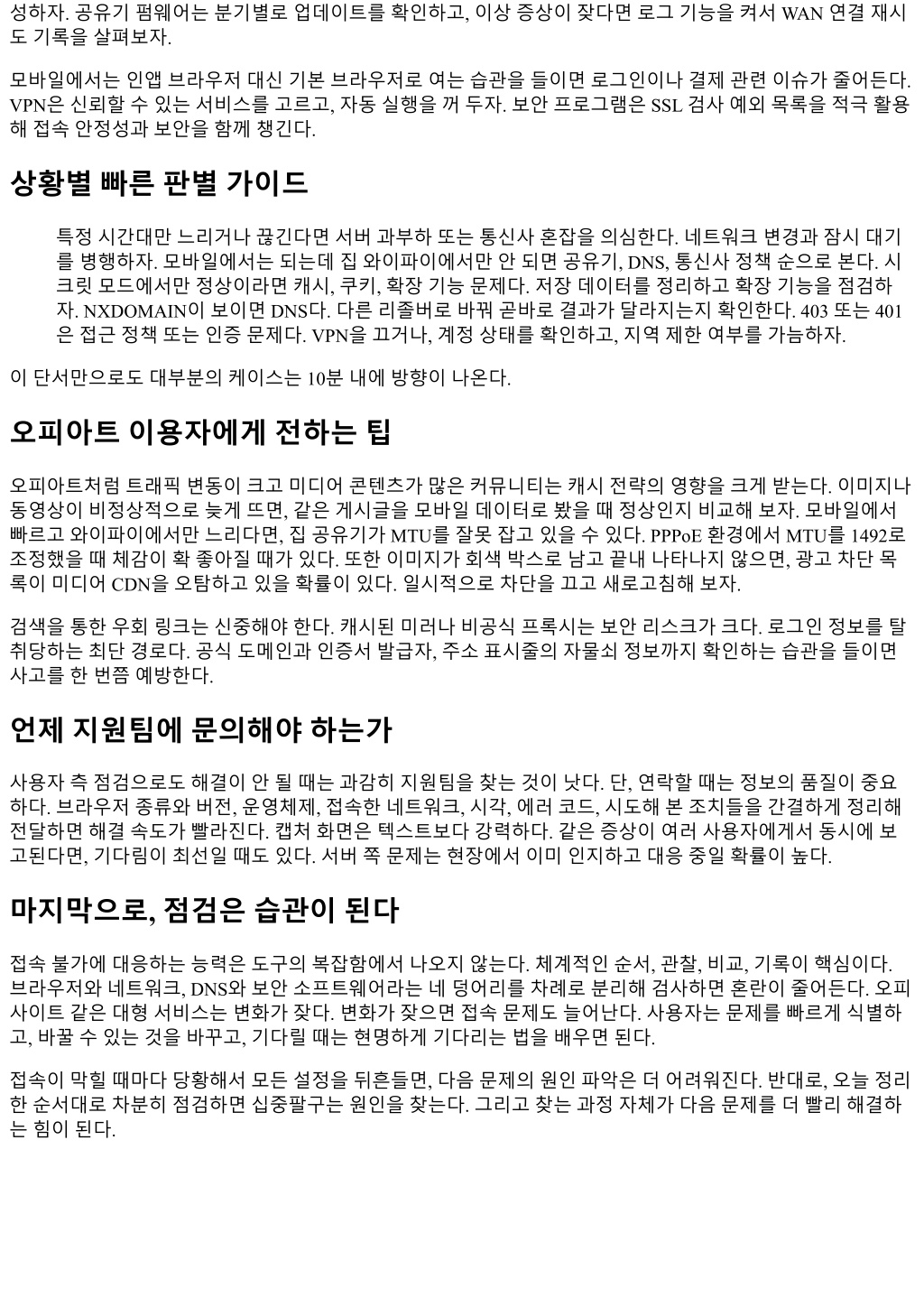 성하자. 공유기펌웨어는분기별로업데이트를확인하고, 이상증상이잦다면로그기능을켜서 WAN 연결재시 도기록을살펴보자. 모바일에서는인앱브라우저대신기본브라우저로여는습관을들이면로그인이나결제관련이슈가줄어든다. VPN은신뢰할수있는서비스를고르고, 자동실행을꺼두자. 보안프로그램은 SSL 검사예외목록을적극활용 해접속안정성과보안을함께챙긴다. 상황별빠른판별가이드 특정시간대만느리거나끊긴다면서버과부하또는통신사혼잡을의심한다. 네트워크변경과잠시대기 를병행하자. 모바일에서는되는데집와이파이에서만안되면공유기, DNS, 통신사정책순으로본다. 시 크릿모드에서만정상이라면캐시, 쿠키, 확장기능문제다. 저장데이터를정리하고확장기능을점검하 자. NXDOMAIN이보이면 DNS다. 다른리졸버로바꿔곧바로결과가달라지는지확인한다. 403 또는 401 은접근정책또는인증문제다. VPN을끄거나, 계정상태를확인하고, 지역제한여부를가늠하자. 이단서만으로도대부분의케이스는 10분내에방향이나온다. 오피아트이용자에게전하는팁 오피아트처럼트래픽변동이크고미디어콘텐츠가많은커뮤니티는캐시전략의영향을크게받는다. 이미지나 동영상이비정상적으로늦게뜨면, 같은게시글을모바일데이터로봤을때정상인지비교해보자. 모바일에서 빠르고와이파이에서만느리다면, 집공유기가 MTU를잘못잡고있을수있다. PPPoE 환경에서 MTU를 1492로 조정했을때체감이확좋아질때가있다. 또한이미지가회색박스로남고끝내나타나지않으면, 광고차단목 록이미디어 CDN을오탐하고있을확률이있다. 일시적으로차단을끄고새로고침해보자. 검색을통한우회링크는신중해야한다. 캐시된미러나비공식프록시는보안리스크가크다. 로그인정보를탈 취당하는최단경로다. 공식도메인과인증서발급자, 주소표시줄의자물쇠정보까지확인하는습관을들이면 사고를한번쯤예방한다. 언제지원팀에문의해야하는가 사용자측점검으로도해결이안될때는과감히지원팀을찾는것이낫다. 단, 연락할때는정보의품질이중요 하다. 브라우저종류와버전, 운영체제, 접속한네트워크, 시각, 에러코드, 시도해본조치들을간결하게정리해 전달하면해결속도가빨라진다. 캡처화면은텍스트보다강력하다. 같은증상이여러사용자에게서동시에보 고된다면, 기다림이최선일때도있다. 서버쪽문제는현장에서이미인지하고대응중일확률이높다. 마지막으로, 점검은습관이된다 접속불가에대응하는능력은도구의복잡함에서나오지않는다. 체계적인순서, 관찰, 비교, 기록이핵심이다. 브라우저와네트워크, DNS와보안소프트웨어라는네덩어리를차례로분리해검사하면혼란이줄어든다. 오피 사이트같은대형서비스는변화가잦다. 변화가잦으면접속문제도늘어난다. 사용자는문제를빠르게식별하 고, 바꿀수있는것을바꾸고, 기다릴때는현명하게기다리는법을배우면된다. 접속이막힐때마다당황해서모든설정을뒤흔들면, 다음문제의원인파악은더어려워진다. 반대로, 오늘정리 한순서대로차분히점검하면십중팔구는원인을찾는다. 그리고찾는과정자체가다음문제를더빨리해결하 는힘이된다.