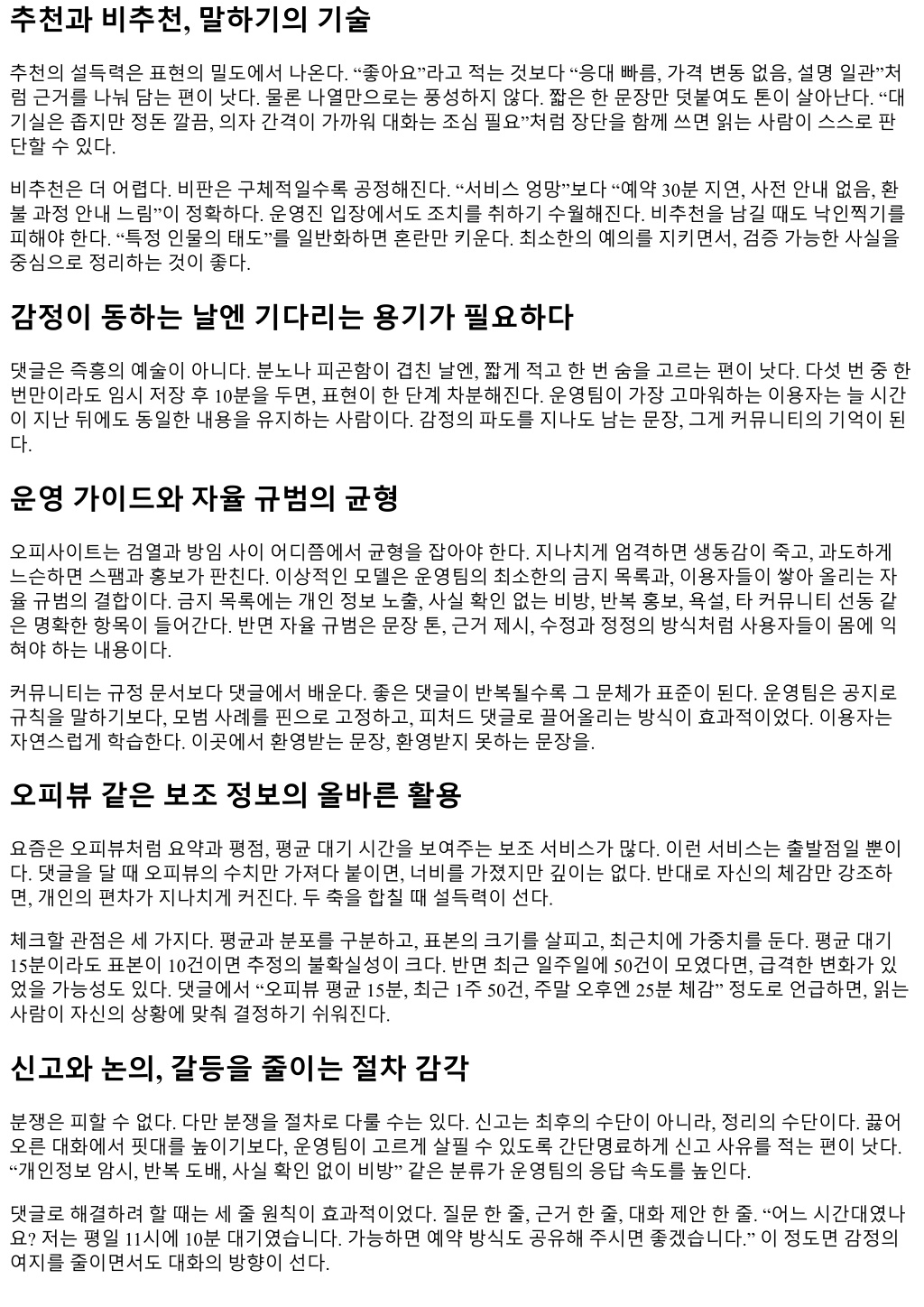 추천과비추천, 말하기의기술 추천의설득력은표현의밀도에서나온다. “좋아요”라고적는것보다 “응대빠름, 가격변동없음, 설명일관”처 럼근거를나눠담는편이낫다. 물론나열만으로는풍성하지않다. 짧은한문장만덧붙여도톤이살아난다. “대 기실은좁지만정돈깔끔, 의자간격이가까워대화는조심필요”처럼장단을함께쓰면읽는사람이스스로판 단할수있다. 비추천은더어렵다. 비판은구체적일수록공정해진다. “서비스엉망”보다 “예약 30분지연, 사전안내없음, 환 불과정안내느림”이정확하다. 운영진입장에서도조치를취하기수월해진다. 비추천을남길때도낙인찍기를 피해야한다. “특정인물의태도”를일반화하면혼란만키운다. 최소한의예의를지키면서, 검증가능한사실을 중심으로정리하는것이좋다. 감정이동하는날엔기다리는용기가필요하다 댓글은즉흥의예술이아니다. 분노나피곤함이겹친날엔, 짧게적고한번숨을고르는편이낫다. 다섯번중한 번만이라도임시저장후 10분을두면, 표현이한단계차분해진다. 운영팀이가장고마워하는이용자는늘시간 이지난뒤에도동일한내용을유지하는사람이다. 감정의파도를지나도남는문장, 그게커뮤니티의기억이된 다. 운영가이드와자율규범의균형 오피사이트는검열과방임사이어디쯤에서균형을잡아야한다. 지나치게엄격하면생동감이죽고, 과도하게 느슨하면스팸과홍보가판친다. 이상적인모델은운영팀의최소한의금지목록과, 이용자들이쌓아올리는자 율규범의결합이다. 금지목록에는개인정보노출, 사실확인없는비방, 반복홍보, 욕설, 타커뮤니티선동같 은명확한항목이들어간다. 반면자율규범은문장톤, 근거제시, 수정과정정의방식처럼사용자들이몸에익 혀야하는내용이다. 커뮤니티는규정문서보다댓글에서배운다. 좋은댓글이반복될수록그문체가표준이된다. 운영팀은공지로 규칙을말하기보다, 모범사례를핀으로고정하고, 피처드댓글로끌어올리는방식이효과적이었다. 이용자는 자연스럽게학습한다. 이곳에서환영받는문장, 환영받지못하는문장을. 오피뷰같은보조정보의올바른활용 요즘은오피뷰처럼요약과평점, 평균대기시간을보여주는보조서비스가많다. 이런서비스는출발점일뿐이 다. 댓글을달때오피뷰의수치만가져다붙이면, 너비를가졌지만깊이는없다. 반대로자신의체감만강조하 면, 개인의편차가지나치게커진다. 두축을합칠때설득력이선다. 체크할관점은세가지다. 평균과분포를구분하고, 표본의크기를살피고, 최근치에가중치를둔다. 평균대기 15분이라도표본이 10건이면추정의불확실성이크다. 반면최근일주일에 50건이모였다면, 급격한변화가있 었을가능성도있다. 댓글에서 “오피뷰평균 15분, 최근 1주 50건, 주말오후엔 25분체감” 정도로언급하면, 읽는 사람이자신의상황에맞춰결정하기쉬워진다. 신고와논의, 갈등을줄이는절차감각 분쟁은피할수없다. 다만분쟁을절차로다룰수는있다. 신고는최후의수단이아니라, 정리의수단이다. 끓어 오른대화에서핏대를높이기보다, 운영팀이고르게살필수있도록간단명료하게신고사유를적는편이낫다. “개인정보암시, 반복도배, 사실확인없이비방” 같은분류가운영팀의응답속도를높인다. 댓글로해결하려할때는세줄원칙이효과적이었다. 질문한줄, 근거한줄, 대화제안한줄. “어느시간대였나 요? 저는평일 11시에 10분대기였습니다. 가능하면예약방식도공유해주시면좋겠습니다.” 이정도면감정의 여지를줄이면서도대화의방향이선다.