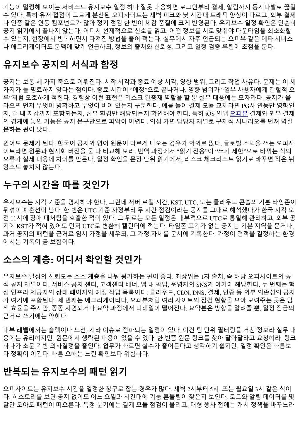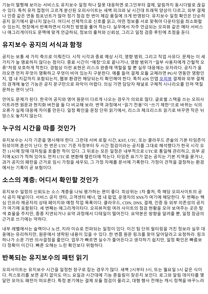 아침에앱을켰을때토큰이만료된상태로깨어난다. 로그인화면으로튕기는현상이늘어난다. 우리는전날밤 토큰갱신을강제로당겨돌리고, 점검시간동안백그라운드갱신을끄는플래그를켰다. 아침 7시기준로그인 실패율이평소대비 15% 증가에서 3% 증가로줄었다. 공지한줄의해석차이가대규모불편을줄였다. 다른사례에서는 CDN 공급사점검이새벽 2시에잡혔다. 대부분의페이지는캐시로버틸수있었지만, 일부개 인화영역이문제였다. 개인화 API 응답이지연되면, 페이지로딩전체가발목잡힌다. 일정확인때개인화영역 을로딩이후로미루는비동기전환을시험적으로적용했다. 사용자에게는기본템플릿이먼저보이고, 개인화 는뒤에서붙었다. 평균 LCP가점검시간에 40% 나빠질것으로예상됐으나, 실제로는 12% 악화에그쳤다. 점검 자체를바꾸진못했어도, 사용자체감은바꿀수있었다. 일정변경과관계관리 유지보수일정을확인하는행위는관계관리와도맞닿아있다. 일정이촘촘해질수록공급사와의커뮤니케이션 이중요해진다. 무례하지않게날카롭게묻는기술이필요하다. “언제끝나나요”보다 “데이터검증에얼마나걸 리나요, 이전작업의평균과편차는어땠나요”가더좋은질문이다. 숫자로대화하면감정이빠진다. 지연이반 복되면비난보다개선제안을쥐여준다. 작업창구를예측가능하게만들자는제안, 종료후자동상태전파를 늘리자는제안처럼구체적인항목이면상대도움직인다. 내부적으로는일정에맞춰리소스를배분해준다. 야간 점검이잦은분기에야간근무보상과교대제를정교하게맞추면, 대응의질이떨어지지않는다. 오피뷰와같은메타채널의쓰임새 오피뷰같은모니터링채널은넓게흩어진공지를한번에훑는데강점이있다. 여러오피사이트를운영하거나 파트너서비스상태를함께봐야하는입장에서는초기에조기경보역할을한다. 다만메타채널은정보의 2차 가공을수반하므로, 일정잠금이나사용자공지확정의근거로는직접출처확인이필요하다. 현장에서내가자 주쓰는방식은이렇다. 새벽시간대에는오피뷰알림으로변화가감지되면, 봇이해당서비스의공식상태페이 지와공지센터를크롤링해원문링크를달아준다. 링크가없거나, 요약과원문이불일치하면, 확인플래그를붉 은색으로표시해담당자가수동검증하도록흐름을만든다. 메타채널은촛불이아니라손전등이다. 방향을보 여주되, 발을디딜자리는직접눈으로확인한다. 두번째리스트: 공지의품질을높이는사용자메시지팁 사용자메시지는짧지만, 일정확인단계에서함께다듬으면효과가크다. 아래다섯가지는매번체크한다. 시간은범위로, 기능은구체적으로, 책임은 1인칭으로쓴다대안경로를제시한다, 예: 결제실패시다른 수단안내종료지연시업데이트시간대를명시한다, 예: 매 30분간격약속한것이지켜졌는지후속알림 으로닫는다불확실성은숨기지말고설명한다, 다만과학적으로간결하게 마지막으로남는것: 예측가능한운영 유지보수일정확인의목표는불가능을가능으로만드는것이아니다. 예측불가능을예측가능으로바꾸는일 이다. 확인의습관, 기록의일관성, 자동화된알림, 스모크테스트, 사용자메시지의정직함이모이면, 점검은사 건이아니라루틴이된다. 서비스는늘움직이고, 의존성은늘변한다. 바뀌는것속에서바꾸지말아야할것은 기준이다. 타임존을통일하고, 소스를계층화하고, 테스트를최소단위로고정하고, 사용자에게는정확한문장 으로말한다. 그러면점검이와도팀은흔들리지않는다. 일정확인은단순한체크가아니다. 서비스의신뢰를지 키는첫관문이다.