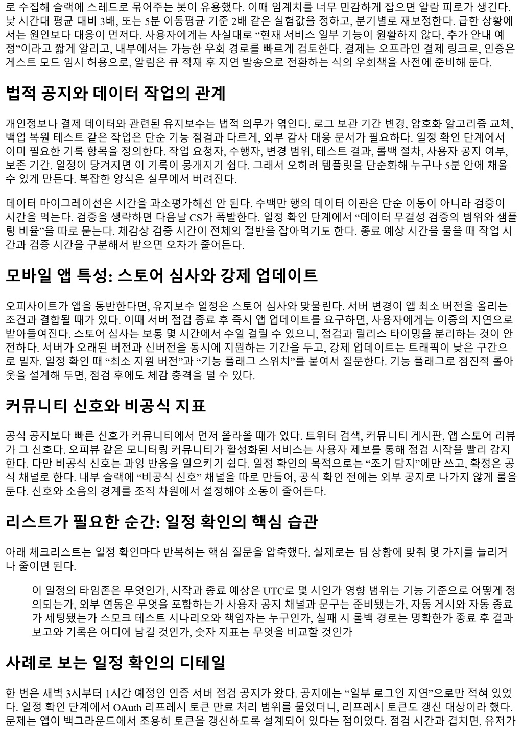 로수집해슬랙에스레드로묶어주는봇이유용했다. 이때임계치를너무민감하게잡으면알람피로가생긴다. 낮시간대평균대비 3배, 또는 5분이동평균기준 2배같은실험값을정하고, 분기별로재보정한다. 급한상황에 서는원인보다대응이먼저다. 사용자에게는사실대로 “현재서비스일부기능이원활하지않다, 추가안내예 정”이라고짧게알리고, 내부에서는가능한우회경로를빠르게검토한다. 결제는오프라인결제링크로, 인증은 게스트모드임시허용으로, 알림은큐적재후지연발송으로전환하는식의우회책을사전에준비해둔다. 법적공지와데이터작업의관계 개인정보나결제데이터와관련된유지보수는법적의무가엮인다. 로그보관기간변경, 암호화알고리즘교체, 백업복원테스트같은작업은단순기능점검과다르게, 외부감사대응문서가필요하다. 일정확인단계에서 이미필요한기록항목을정의한다. 작업요청자, 수행자, 변경범위, 테스트결과, 롤백절차, 사용자공지여부, 보존기간. 일정이당겨지면이기록이뭉개지기쉽다. 그래서오히려템플릿을단순화해누구나 5분안에채울 수있게만든다. 복잡한양식은실무에서버려진다. 데이터마이그레이션은시간을과소평가해선안된다. 수백만행의데이터이관은단순이동이아니라검증이 시간을먹는다. 검증을생략하면다음날 CS가폭발한다. 일정확인단계에서 “데이터무결성검증의범위와샘플 링비율”을따로묻는다. 체감상검증시간이전체의절반을잡아먹기도한다. 종료예상시간을물을때작업시 간과검증시간을구분해서받으면오차가줄어든다. 모바일앱특성: 스토어심사와강제업데이트 오피사이트가앱을동반한다면, 유지보수일정은스토어심사와맞물린다. 서버변경이앱최소버전을올리는 조건과결합될때가있다. 이때서버점검종료후즉시앱업데이트를요구하면, 사용자에게는이중의지연으로 받아들여진다. 스토어심사는보통몇시간에서수일걸릴수있으니, 점검과릴리스타이밍을분리하는것이안 전하다. 서버가오래된버전과신버전을동시에지원하는기간을두고, 강제업데이트는트래픽이낮은구간으 로밀자. 일정확인때 “최소지원버전”과 “기능플래그스위치”를붙여서질문한다. 기능플래그로점진적롤아 웃을설계해두면, 점검후에도체감충격을덜수있다. 커뮤니티신호와비공식지표 공식공지보다빠른신호가커뮤니티에서먼저올라올때가있다. 트위터검색, 커뮤니티게시판, 앱스토어리뷰 가그신호다. 오피뷰같은모니터링커뮤니티가활성화된서비스는사용자제보를통해점검시작을빨리감지 한다. 다만비공식신호는과잉반응을일으키기쉽다. 일정확인의목적으로는 “조기탐지”에만쓰고, 확정은공 식채널로한다. 내부슬랙에 “비공식신호” 채널을따로만들어, 공식확인전에는외부공지로나가지않게룰을 둔다. 신호와소음의경계를조직차원에서설정해야소동이줄어든다. 리스트가필요한순간: 일정확인의핵심습관 아래체크리스트는일정확인마다반복하는핵심질문을압축했다. 실제로는팀상황에맞춰몇가지를늘리거 나줄이면된다. 이일정의타임존은무엇인가, 시작과종료예상은 UTC로몇시인가영향범위는기능기준으로어떻게정 의되는가, 외부연동은무엇을포함하는가사용자공지채널과문구는준비됐는가, 자동게시와자동종료 가세팅됐는가스모크테스트시나리오와책임자는누구인가, 실패시롤백경로는명확한가종료후결과 보고와기록은어디에남길것인가, 숫자지표는무엇을비교할것인가 사례로보는일정확인의디테일 한번은새벽 3시부터 1시간예정인인증서버점검공지가왔다. 공지에는 “일부로그인지연”으로만적혀있었 다. 일정확인단계에서 OAuth 리프레시토큰만료처리범위를물었더니, 리프레시토큰도갱신대상이라했다. 문제는앱이백그라운드에서조용히토큰을갱신하도록설계되어있다는점이었다. 점검시간과겹치면, 유저가