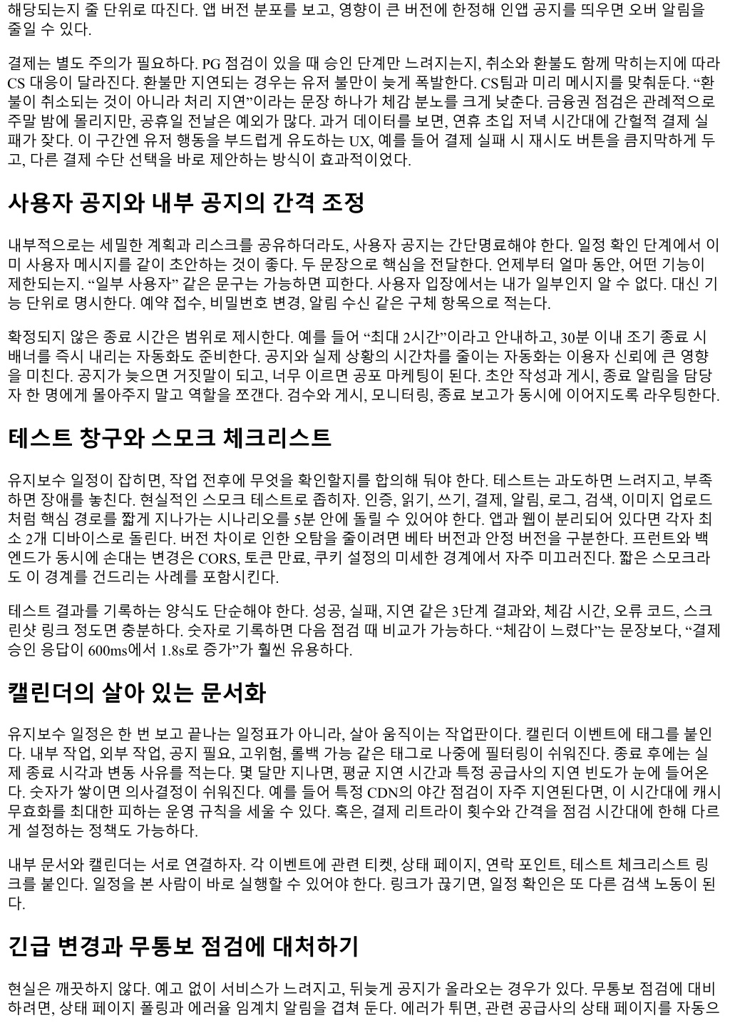 해당되는지줄단위로따진다. 앱버전분포를보고, 영향이큰버전에한정해인앱공지를띄우면오버알림을 줄일수있다. 결제는별도주의가필요하다. PG 점검이있을때승인단계만느려지는지, 취소와환불도함께막히는지에따라 CS 대응이달라진다. 환불만지연되는경우는유저불만이늦게폭발한다. CS팀과미리메시지를맞춰둔다. “환 불이취소되는것이아니라처리지연”이라는문장하나가체감분노를크게낮춘다. 금융권점검은관례적으로 주말밤에몰리지만, 공휴일전날은예외가많다. 과거데이터를보면, 연휴초입저녁시간대에간헐적결제실 패가잦다. 이구간엔유저행동을부드럽게유도하는 UX, 예를들어결제실패시재시도버튼을큼지막하게두 고, 다른결제수단선택을바로제안하는방식이효과적이었다. 사용자공지와내부공지의간격조정 내부적으로는세밀한계획과리스크를공유하더라도, 사용자공지는간단명료해야한다. 일정확인단계에서이 미사용자메시지를같이초안하는것이좋다. 두문장으로핵심을전달한다. 언제부터얼마동안, 어떤기능이 제한되는지. “일부사용자” 같은문구는가능하면피한다. 사용자입장에서는내가일부인지알수없다. 대신기 능단위로명시한다. 예약접수, 비밀번호변경, 알림수신같은구체항목으로적는다. 확정되지않은종료시간은범위로제시한다. 예를들어 “최대 2시간”이라고안내하고, 30분이내조기종료시 배너를즉시내리는자동화도준비한다. 공지와실제상황의시간차를줄이는자동화는이용자신뢰에큰영향 을미친다. 공지가늦으면거짓말이되고, 너무이르면공포마케팅이된다. 초안작성과게시, 종료알림을담당 자한명에게몰아주지말고역할을쪼갠다. 검수와게시, 모니터링, 종료보고가동시에이어지도록라우팅한다. 테스트창구와스모크체크리스트 유지보수일정이잡히면, 작업전후에무엇을확인할지를합의해둬야한다. 테스트는과도하면느려지고, 부족 하면장애를놓친다. 현실적인스모크테스트로좁히자. 인증, 읽기, 쓰기, 결제, 알림, 로그, 검색, 이미지업로드 처럼핵심경로를짧게지나가는시나리오를 5분안에돌릴수있어야한다. 앱과웹이분리되어있다면각자최 소 2개디바이스로돌린다. 버전차이로인한오탐을줄이려면베타버전과안정버전을구분한다. 프런트와백 엔드가동시에손대는변경은 CORS, 토큰만료, 쿠키설정의미세한경계에서자주미끄러진다. 짧은스모크라 도이경계를건드리는사례를포함시킨다. 테스트결과를기록하는양식도단순해야한다. 성공, 실패, 지연같은 3단계결과와, 체감시간, 오류코드, 스크 린샷링크정도면충분하다. 숫자로기록하면다음점검때비교가가능하다. “체감이느렸다”는문장보다, “결제 승인응답이 600ms에서 1.8s로증가”가훨씬유용하다. 캘린더의살아있는문서화 유지보수일정은한번보고끝나는일정표가아니라, 살아움직이는작업판이다. 캘린더이벤트에태그를붙인 다. 내부작업, 외부작업, 공지필요, 고위험, 롤백가능같은태그로나중에필터링이쉬워진다. 종료후에는실 제종료시각과변동사유를적는다. 몇달만지나면, 평균지연시간과특정공급사의지연빈도가눈에들어온 다. 숫자가쌓이면의사결정이쉬워진다. 예를들어특정 CDN의야간점검이자주지연된다면, 이시간대에캐시 무효화를최대한피하는운영규칙을세울수있다. 혹은, 결제리트라이횟수와간격을점검시간대에한해다르 게설정하는정책도가능하다. 내부문서와캘린더는서로연결하자. 각이벤트에관련티켓, 상태페이지, 연락포인트, 테스트체크리스트링 크를붙인다. 일정을본사람이바로실행할수있어야한다. 링크가끊기면, 일정확인은또다른검색노동이된 다. 긴급변경과무통보점검에대처하기 현실은깨끗하지않다. 예고없이서비스가느려지고, 뒤늦게공지가올라오는경우가있다. 무통보점검에대비 하려면, 상태페이지폴링과에러율임계치알림을겹쳐둔다. 에러가튀면, 관련공급사의상태페이지를자동으