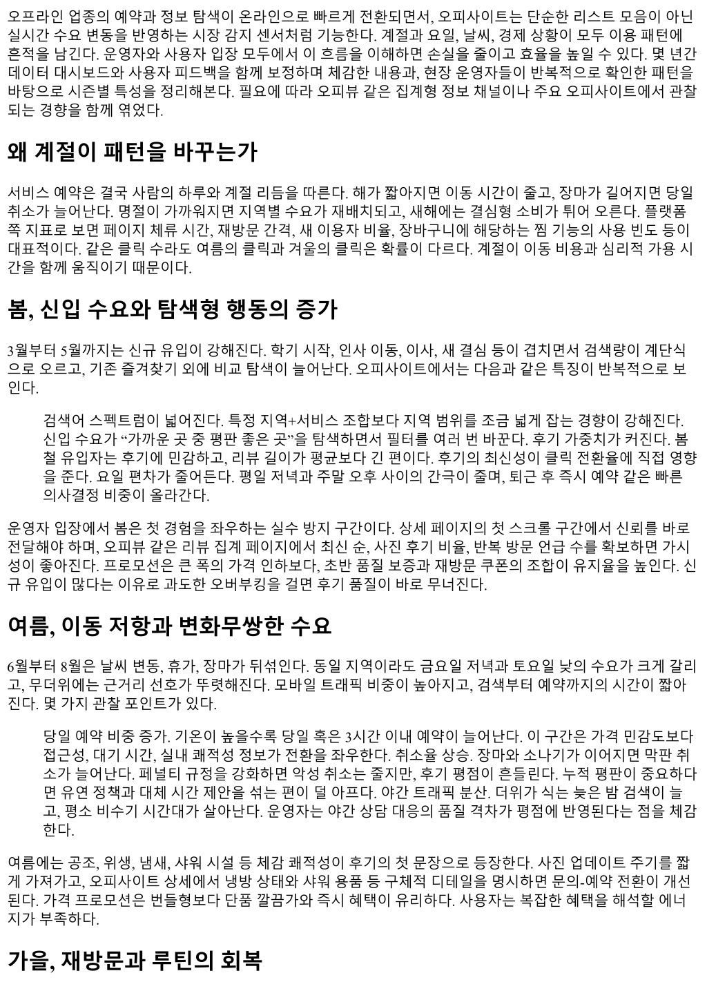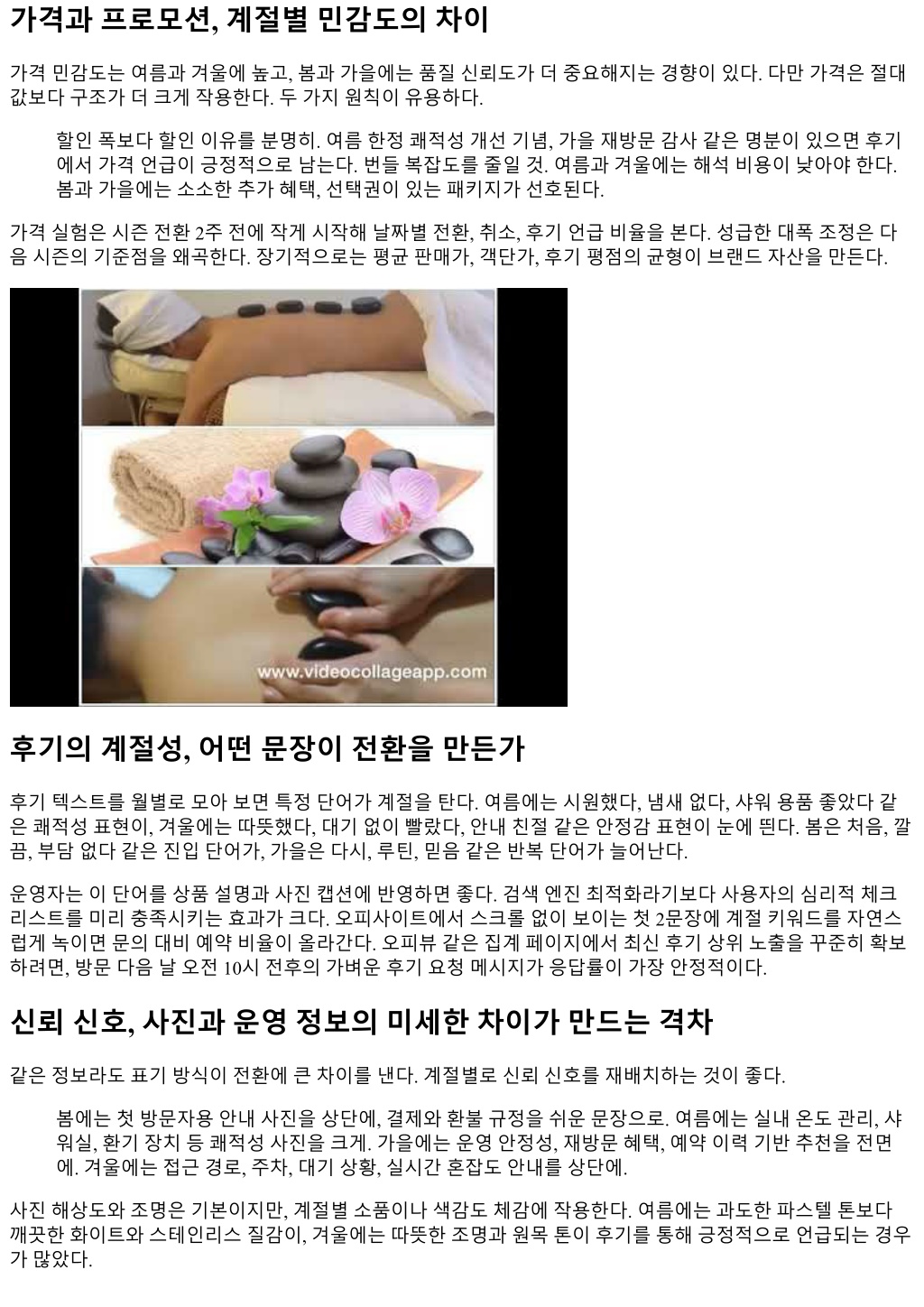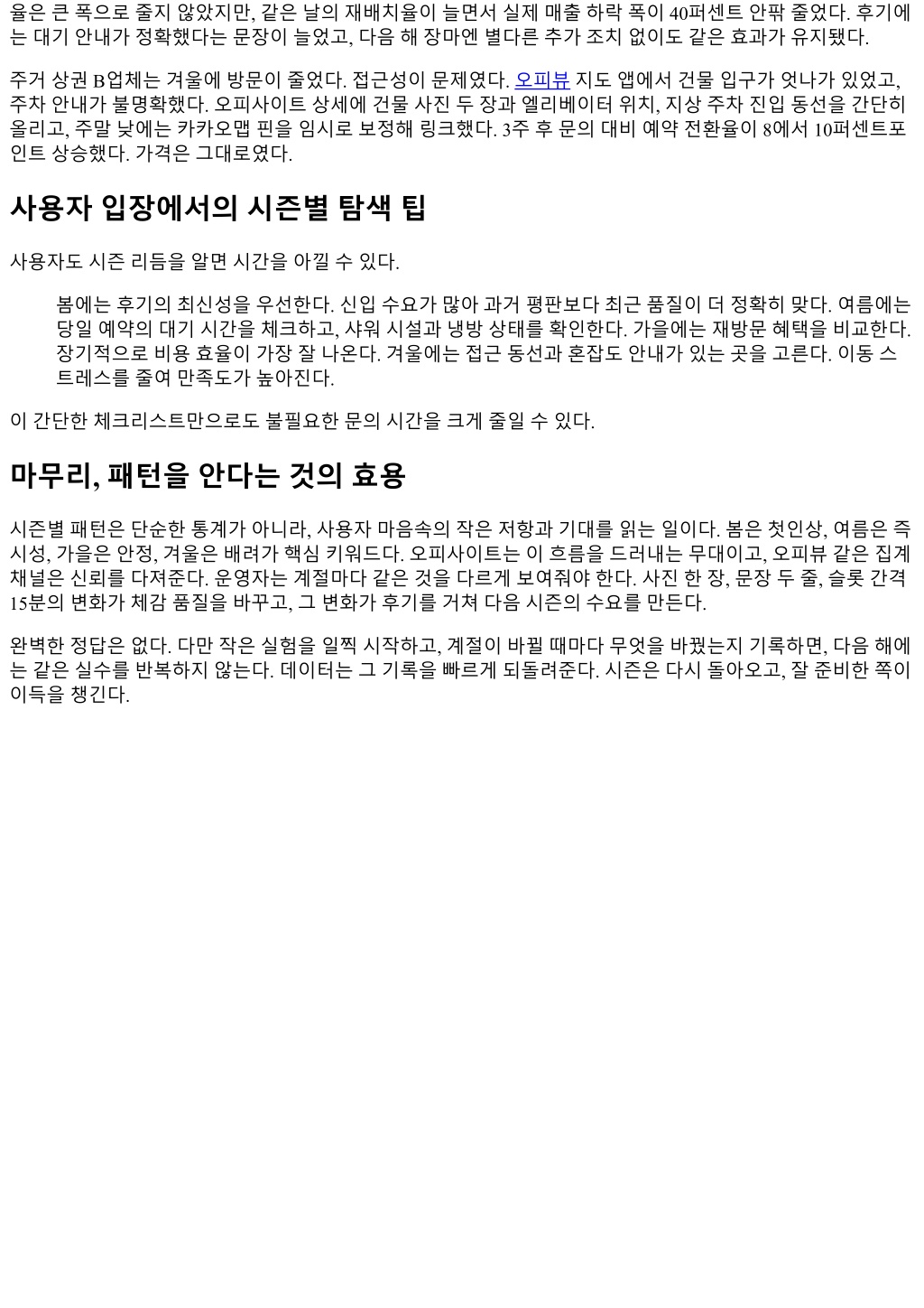 가격과프로모션, 계절별민감도의차이 가격민감도는여름과겨울에높고, 봄과가을에는품질신뢰도가더중요해지는경향이있다. 다만가격은절대 값보다구조가더크게작용한다. 두가지원칙이유용하다. 할인폭보다할인이유를분명히. 여름한정쾌적성개선기념, 가을재방문감사같은명분이있으면후기 에서가격언급이긍정적으로남는다. 번들복잡도를줄일것. 여름과겨울에는해석비용이낮아야한다. 봄과가을에는소소한추가혜택, 선택권이있는패키지가선호된다. 가격실험은시즌전환 2주전에작게시작해날짜별전환, 취소, 후기언급비율을본다. 성급한대폭조정은다 음시즌의기준점을왜곡한다. 장기적으로는평균판매가, 객단가, 후기평점의균형이브랜드자산을만든다. 후기의계절성, 어떤문장이전환을만든가 후기텍스트를월별로모아보면특정단어가계절을탄다. 여름에는시원했다, 냄새없다, 샤워용품좋았다같 은쾌적성표현이, 겨울에는따뜻했다, 대기없이빨랐다, 안내친절같은안정감표현이눈에띈다. 봄은처음, 깔 끔, 부담없다같은진입단어가, 가을은다시, 루틴, 믿음같은반복단어가늘어난다. 운영자는이단어를상품설명과사진캡션에반영하면좋다. 검색엔진최적화라기보다사용자의심리적체크 리스트를미리충족시키는효과가크다. 오피사이트에서스크롤없이보이는첫 2문장에계절키워드를자연스 럽게녹이면문의대비예약비율이올라간다. 오피뷰같은집계페이지에서최신후기상위노출을꾸준히확보 하려면, 방문다음날오전 10시전후의가벼운후기요청메시지가응답률이가장안정적이다. 신뢰신호, 사진과운영정보의미세한차이가만드는격차 같은정보라도표기방식이전환에큰차이를낸다. 계절별로신뢰신호를재배치하는것이좋다. 봄에는첫방문자용안내사진을상단에, 결제와환불규정을쉬운문장으로. 여름에는실내온도관리, 샤 워실, 환기장치등쾌적성사진을크게. 가을에는운영안정성, 재방문혜택, 예약이력기반추천을전면 에. 겨울에는접근경로, 주차, 대기상황, 실시간혼잡도안내를상단에. 사진해상도와조명은기본이지만, 계절별소품이나색감도체감에작용한다. 여름에는과도한파스텔톤보다 깨끗한화이트와스테인리스질감이, 겨울에는따뜻한조명과원목톤이후기를통해긍정적으로언급되는경우 가많았다.