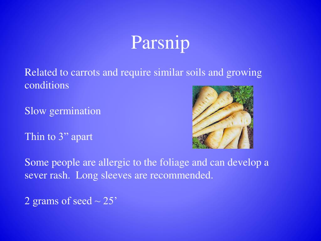 Parsnip Related to carrots and require similar soils and growing conditions Slow germination Thin to 3” apart Some people are allergic to the foliage and can develop a sever rash. Long sleeves are recommended. 2 grams of seed ~ 25’