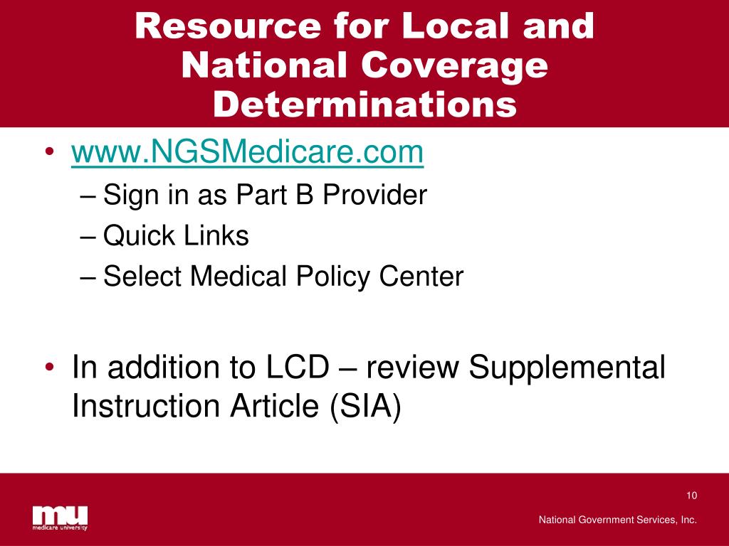 Resource for Local and National Coverage Determinations www.NGSMedicare.com Sign in as Part B Provider Quick Links Select Medical Policy Center In addition to LCD – review Supplemental Instruction Article (SIA)
