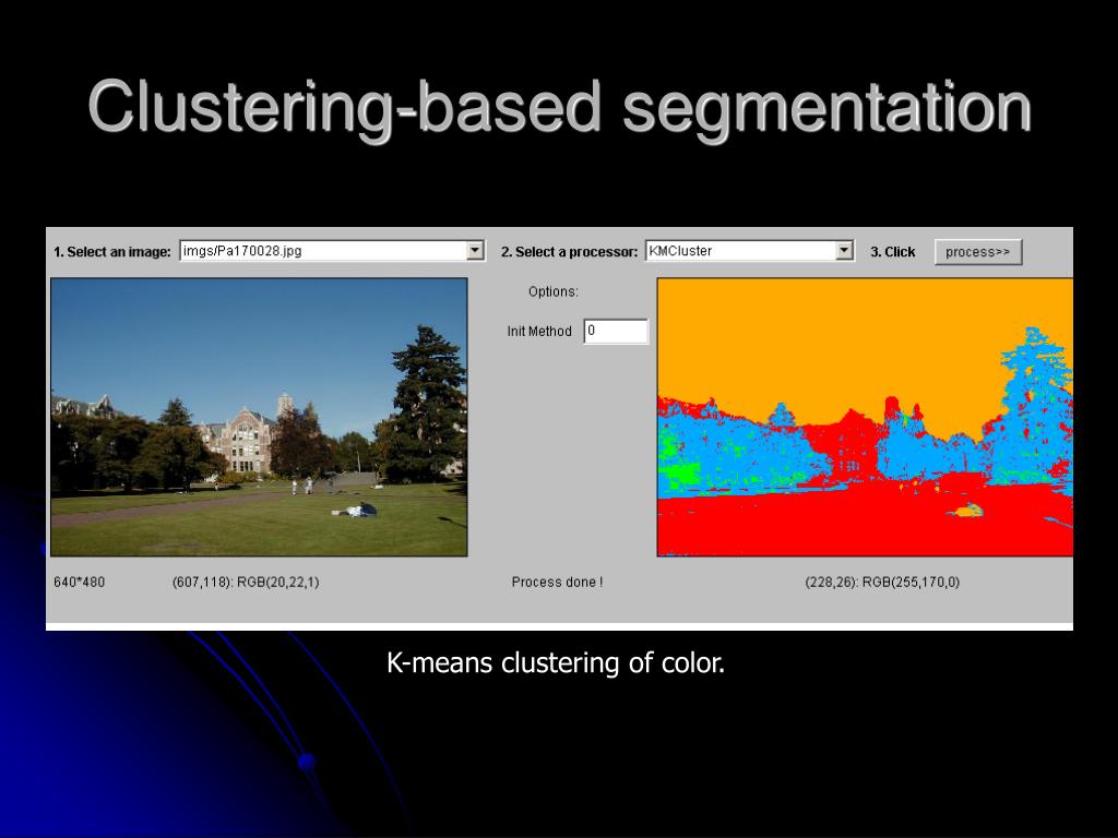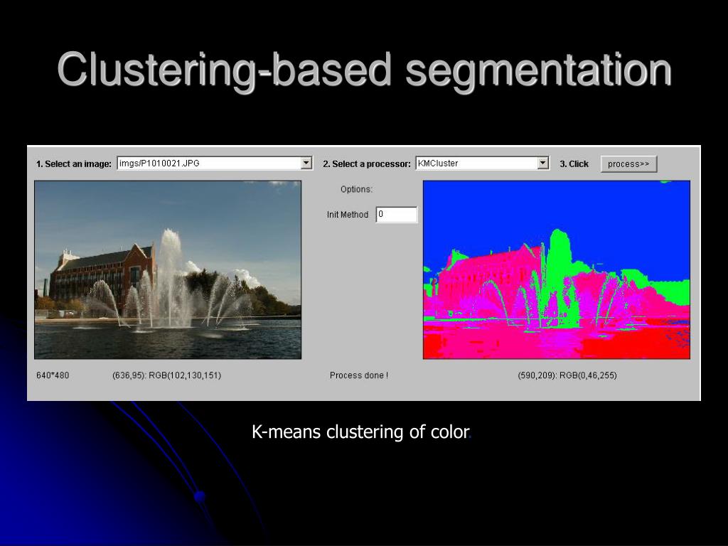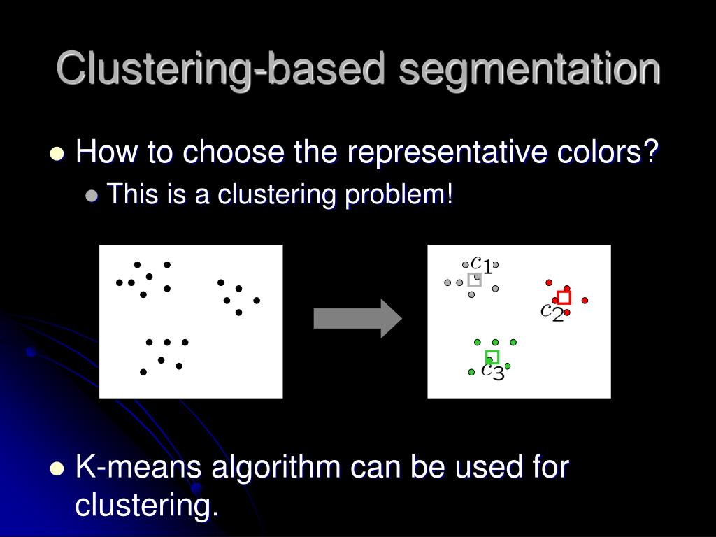 Clustering-based segmentation • How to choose the representative colors? • This is a clustering problem! • K-means algorithm can be used for clustering.