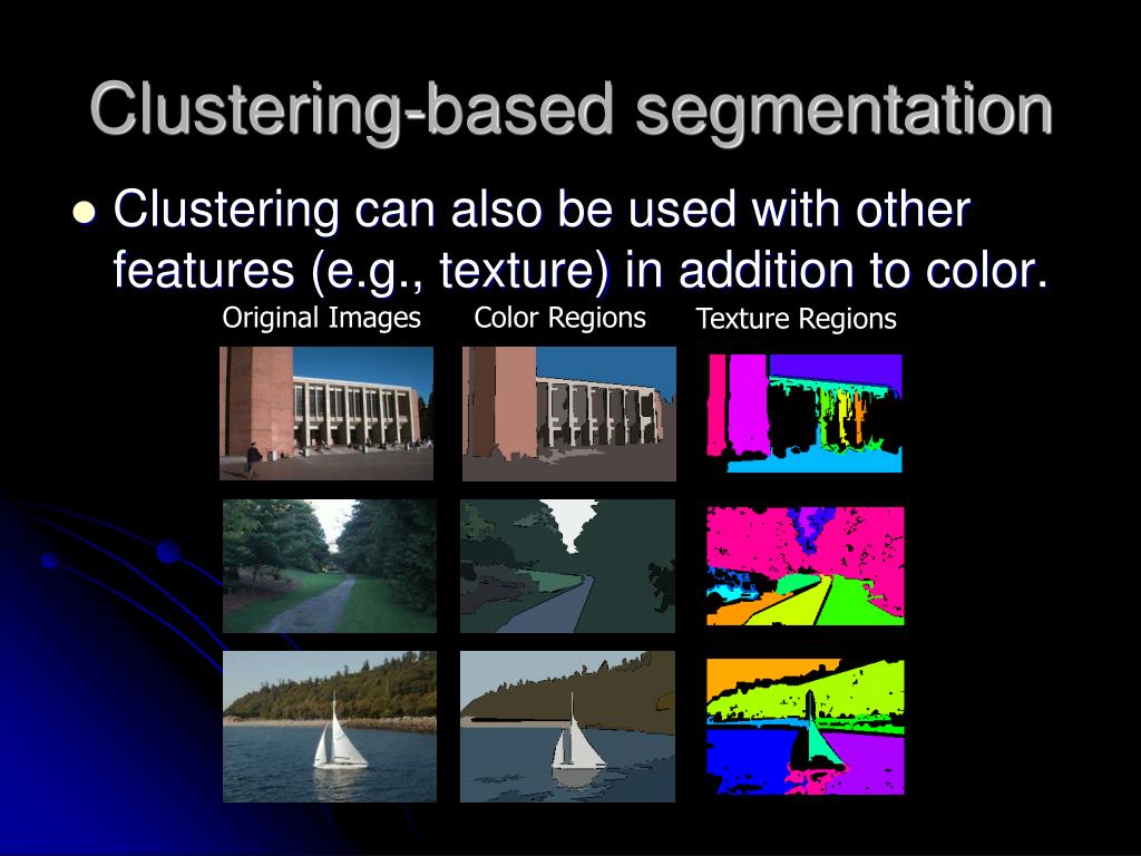 Clustering-based segmentation • Clustering can also be used with other features (e.g., texture) in addition to color. Original Images Color Regions Texture Regions
