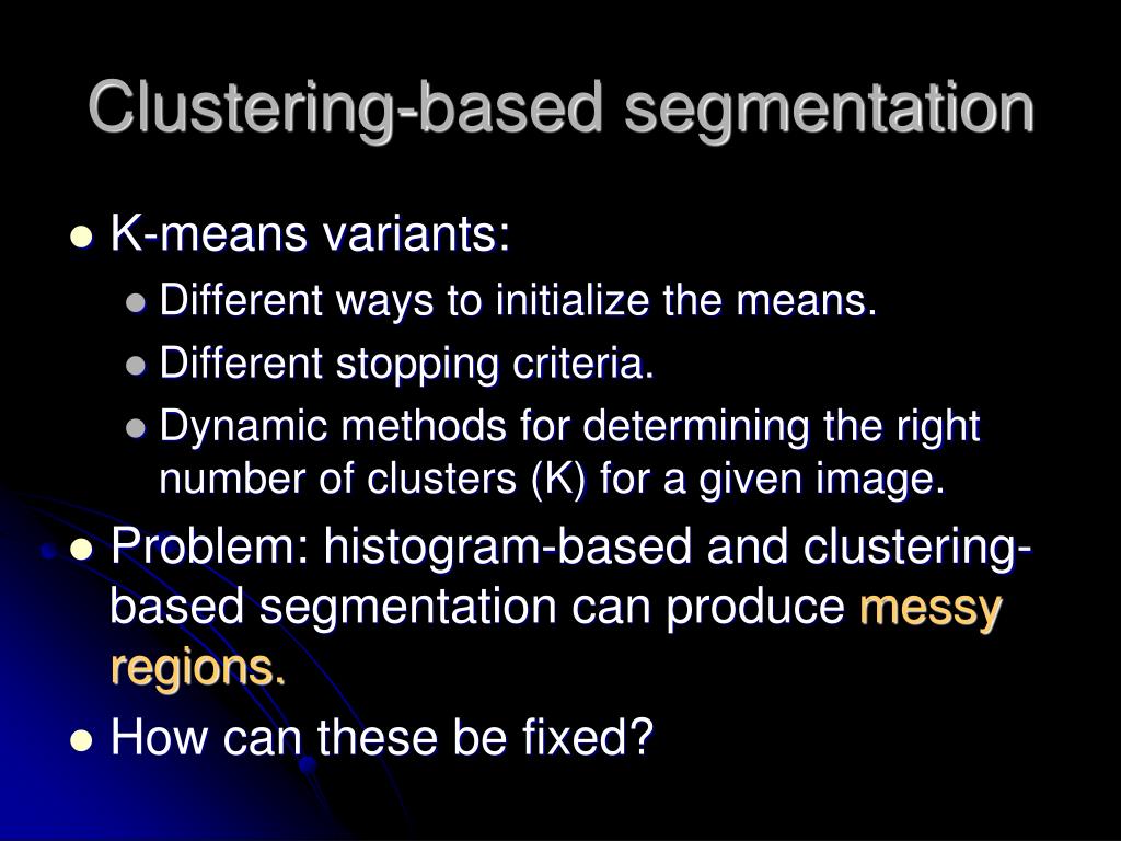 Clustering-based segmentation • K-means variants: • Different ways to initialize the means. • Different stopping criteria. • Dynamic methods for determining the right number of clusters (K) for a given image. • Problem: histogram-based and clustering-based segmentation can produce messy regions. • How can these be fixed?
