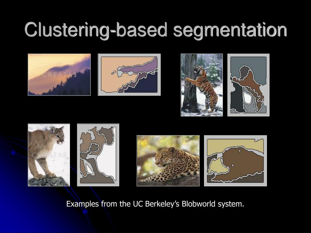 Clustering-based segmentation Examples from the UC Berkeley’s Blobworld system.