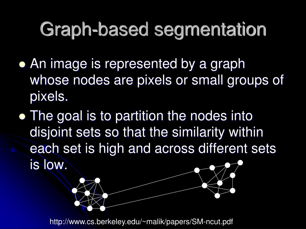 Graph-based segmentation • An image is represented by a graph whose nodes are pixels or small groups of pixels. • The goal is to partition the nodes into disjoint sets so that the similarity within each set is high and across different sets is low. http://www.cs.berkeley.edu/~malik/papers/SM-ncut.pdf