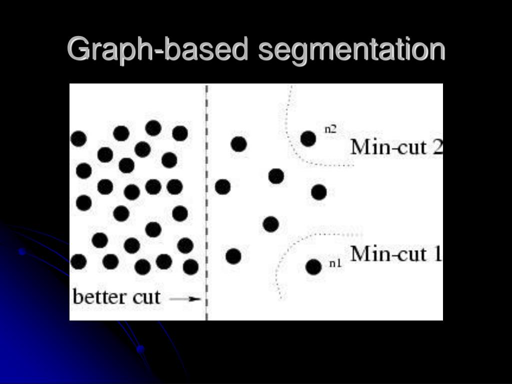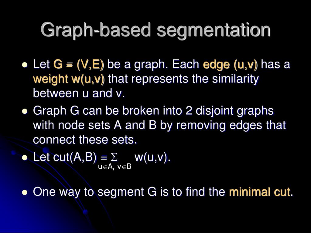 Graph-based segmentation • Let G = (V,E) be a graph. Each edge (u,v) has a weight w(u,v) that represents the similarity between u and v. • Graph G can be broken into 2 disjoint graphs with node sets A and B by removing edges that connect these sets. • Let cut(A,B) = w(u,v). • One way to segment G is to find the minimal cut. uA, vB