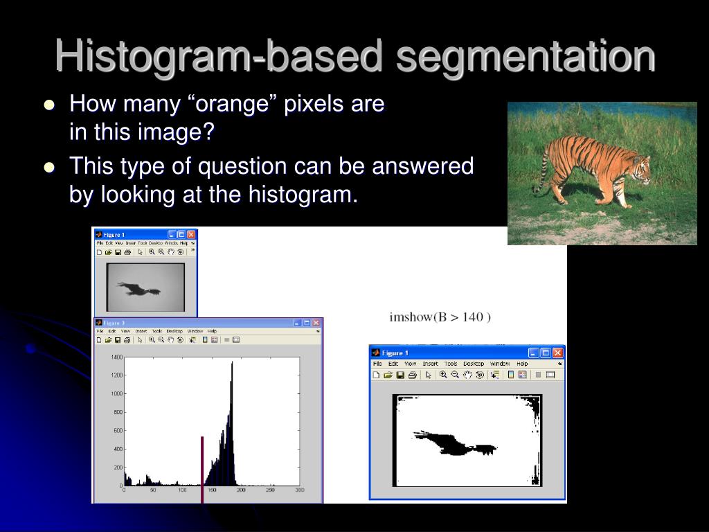 Histogram-based segmentation • How many “orange” pixels arein this image? • This type of question can be answeredby looking at the histogram.