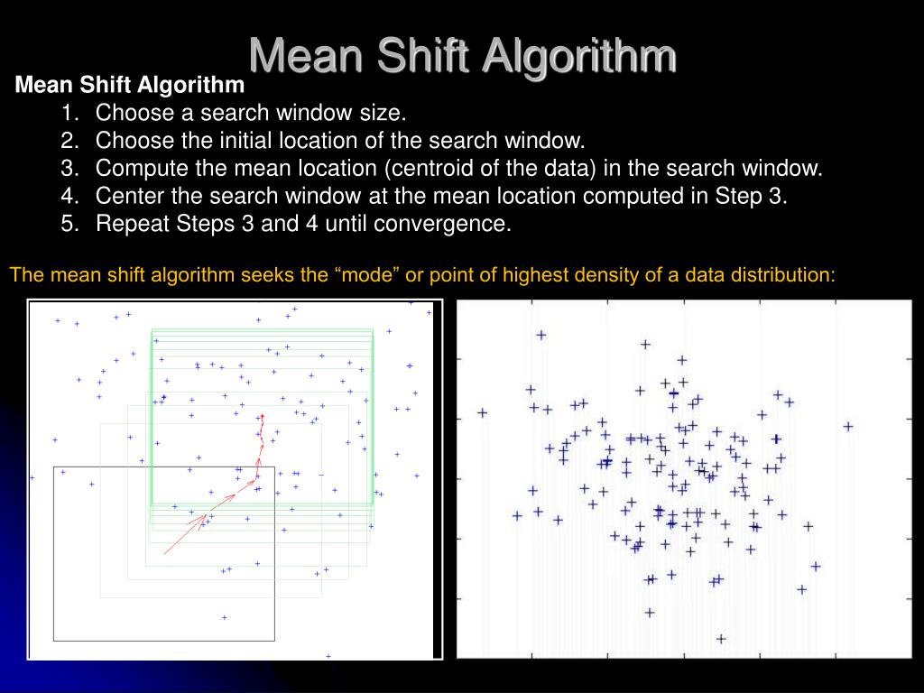 Mean Shift Algorithm • Mean Shift Algorithm • Choose a search window size. • Choose the initial location of the search window. • Compute the mean location (centroid of the data) in the search window. • Center the search window at the mean location computed in Step 3. • Repeat Steps 3 and 4 until convergence. The mean shift algorithm seeks the “mode” or point of highest density of a data distribution: