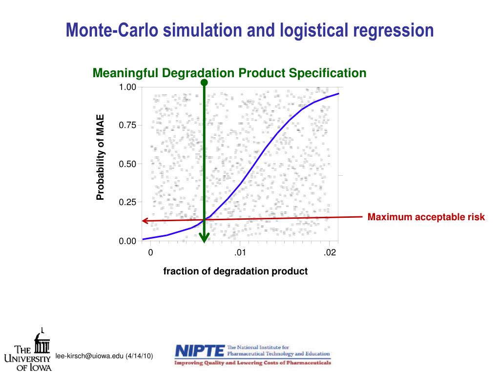 1.00 0.75 0.50 0.25 0.00 0 .01 .02 Monte-Carlo simulation and logistical regression Meaningful Degradation Product Specification Probability of MAE Maximum acceptable risk fraction of degradation product lee-kirsch@uiowa.edu (4/14/10)