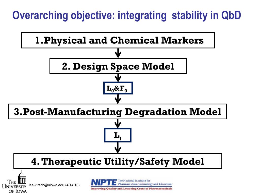 Overarching objective: integrating stability in QbD 1.Physical and Chemical Markers 2. Design Space Model L0&F0 3.Post-Manufacturing Degradation Model Lt 4. Therapeutic Utility/Safety Model lee-kirsch@uiowa.edu (4/14/10)