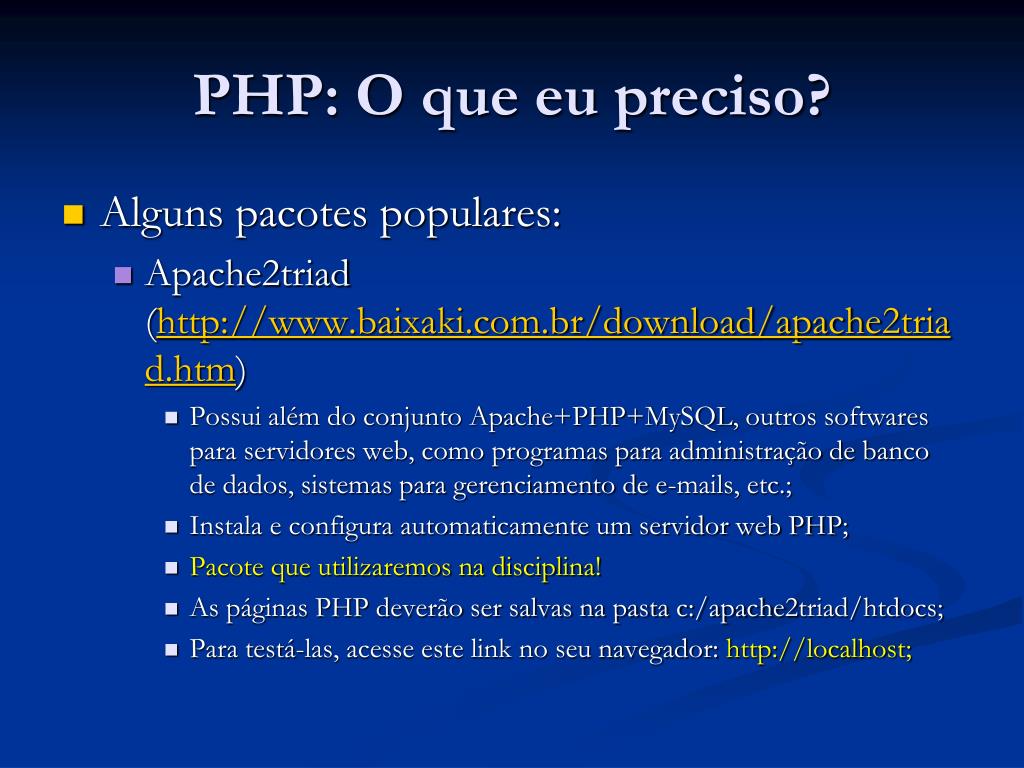 PHP: O que eu preciso? • Alguns pacotes populares: • Apache2triad (http://www.baixaki.com.br/download/apache2triad.htm) • Possui além do conjunto Apache+PHP+MySQL, outros softwares para servidores web, como programas para administração de banco de dados, sistemas para gerenciamento de e-mails, etc.; • Instala e configura automaticamente um servidor web PHP; • Pacote que utilizaremos na disciplina! • As páginas PHP deverão ser salvas na pasta c:/apache2triad/htdocs; • Para testá-las, acesse este link no seu navegador: http://localhost;